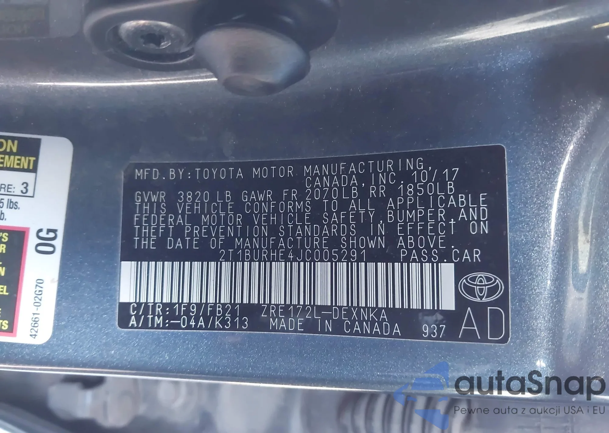 LOT: 43920073 VIN: 2T1BURHE4JC005291