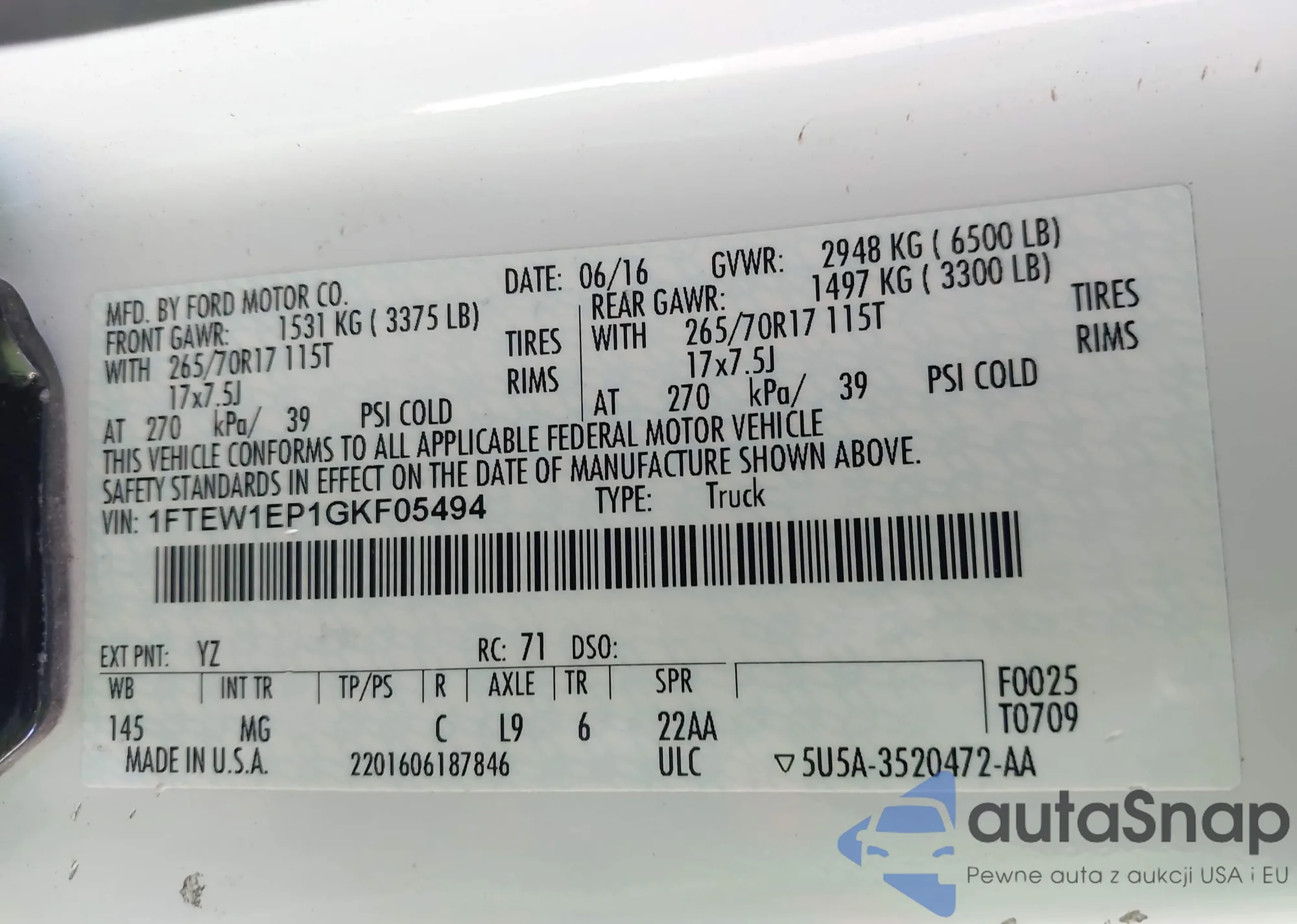 LOT: 43875567 VIN: 1FTEW1EP1GKF05494