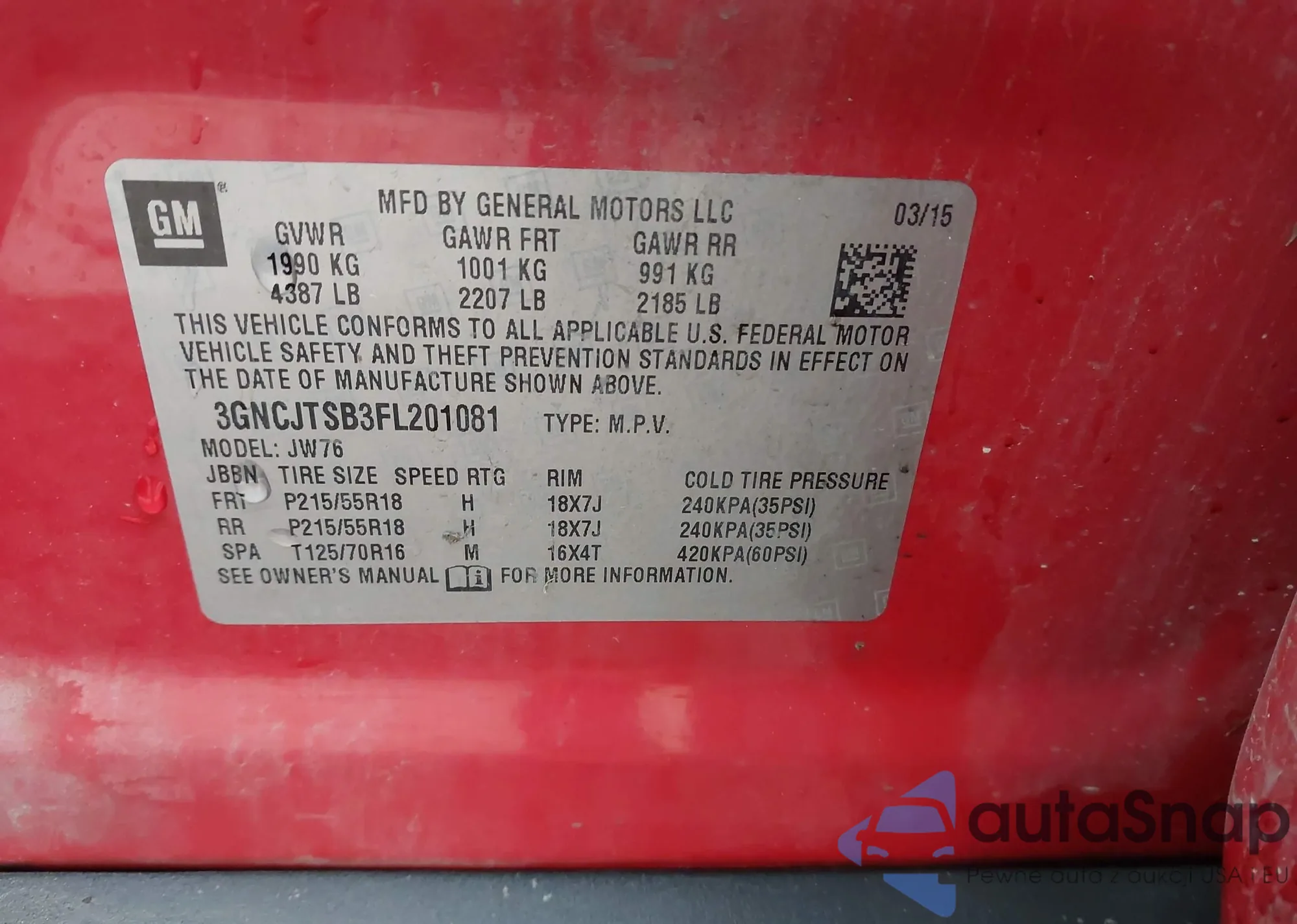 LOT: 43977975 VIN: 3GNCJTSB3FL201081