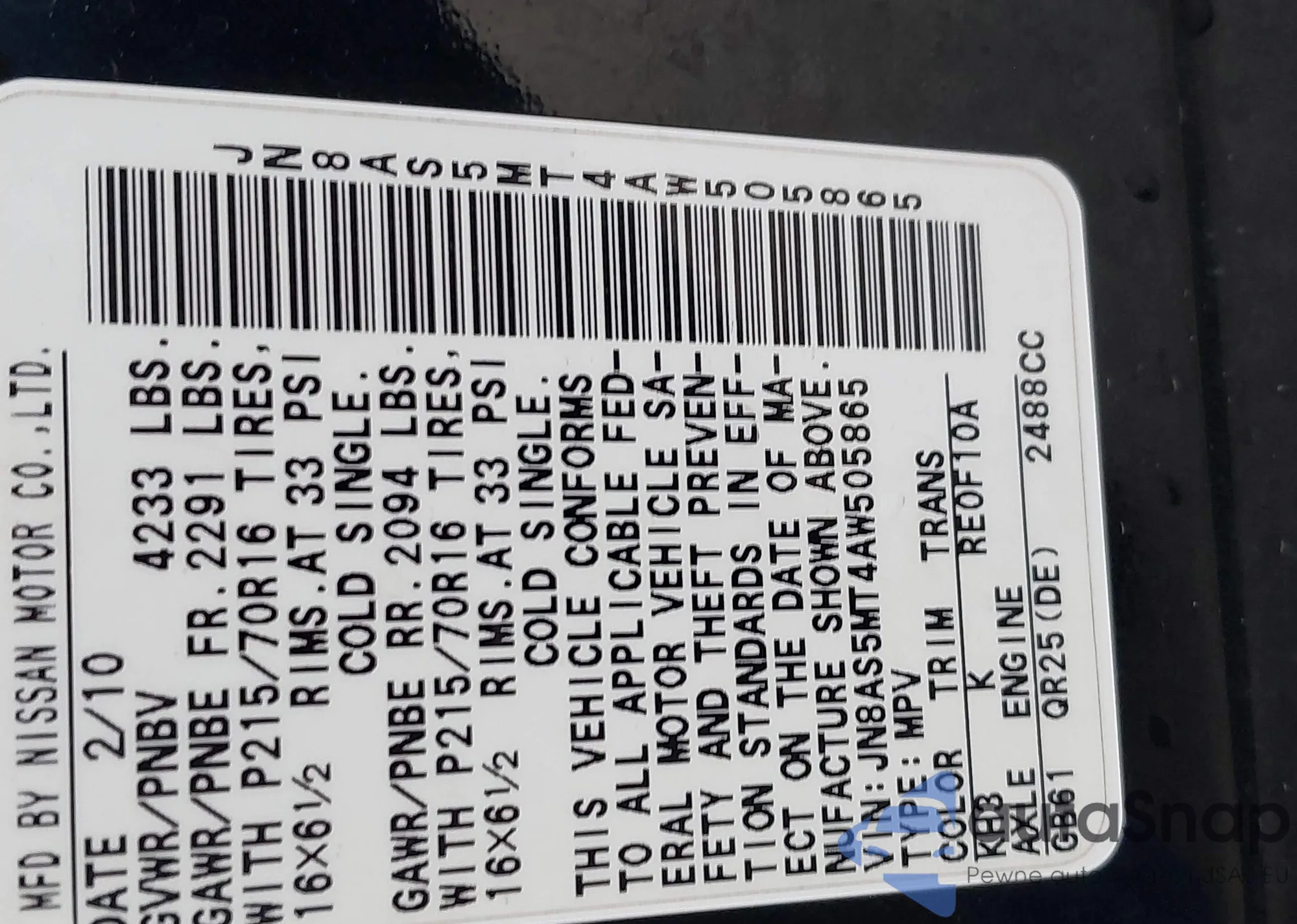 • VIN JN8AS5MT4AW505865