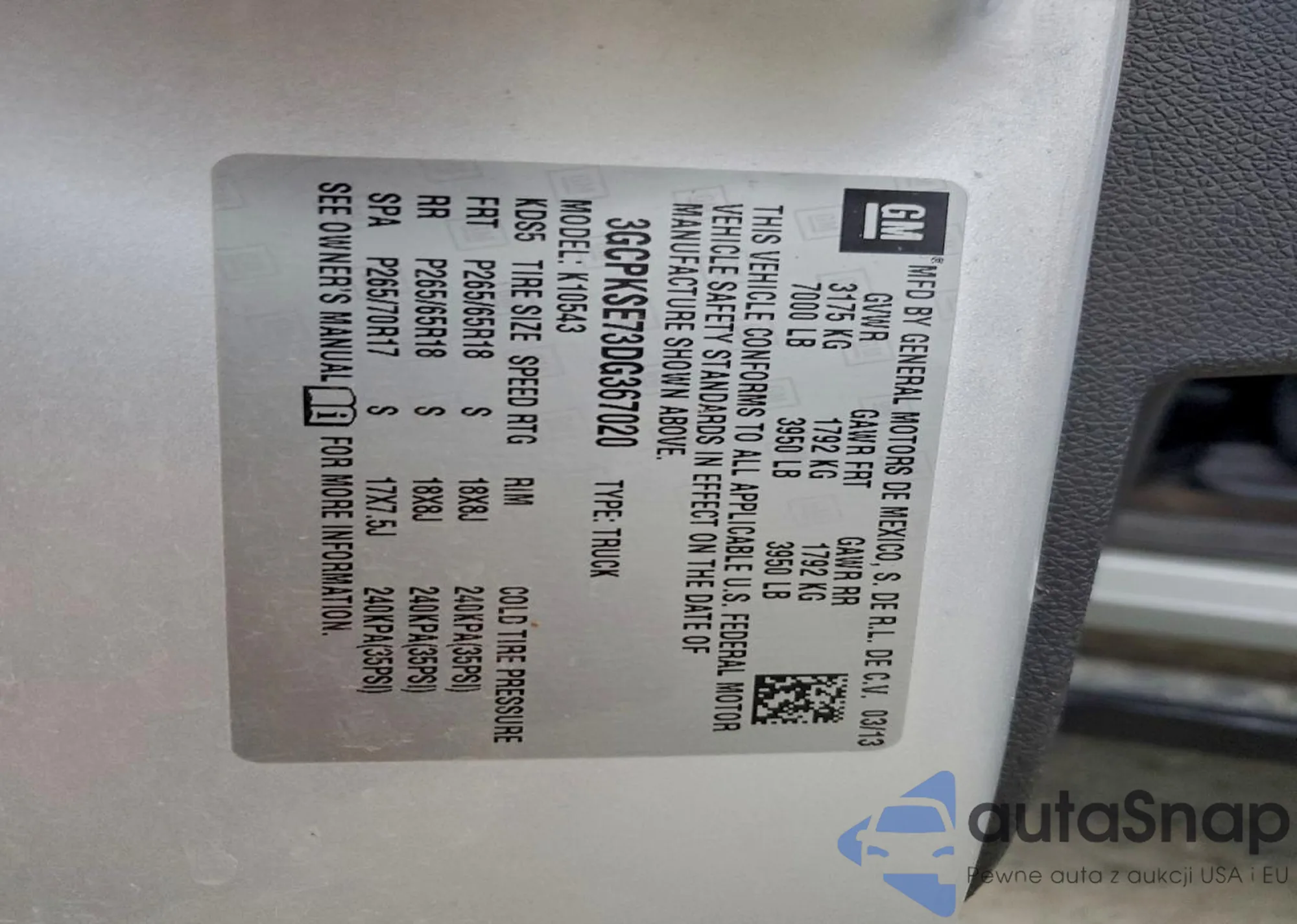 • VIN 3GCPKSE73DG367020