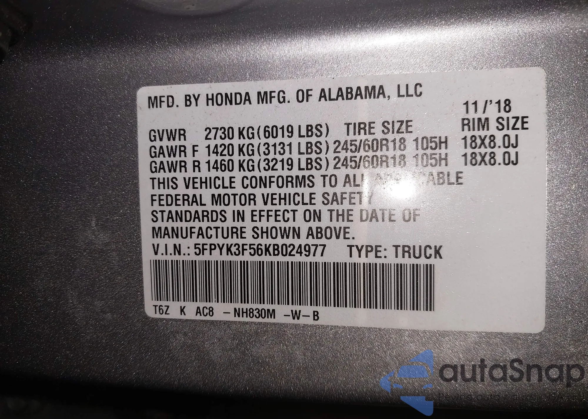 • VIN 5FPYK3F56KB024977