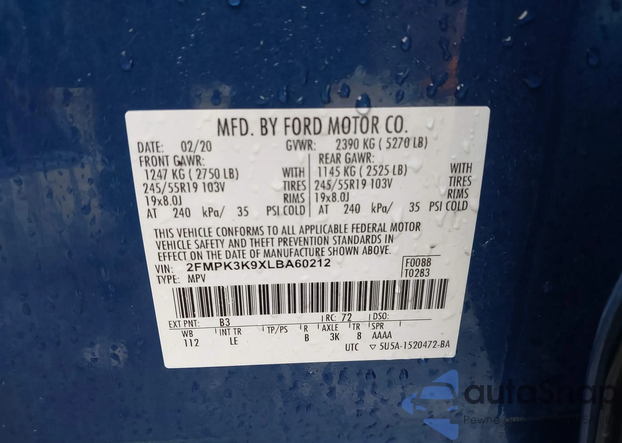 • VIN 2FMPK3K9XLBA60212