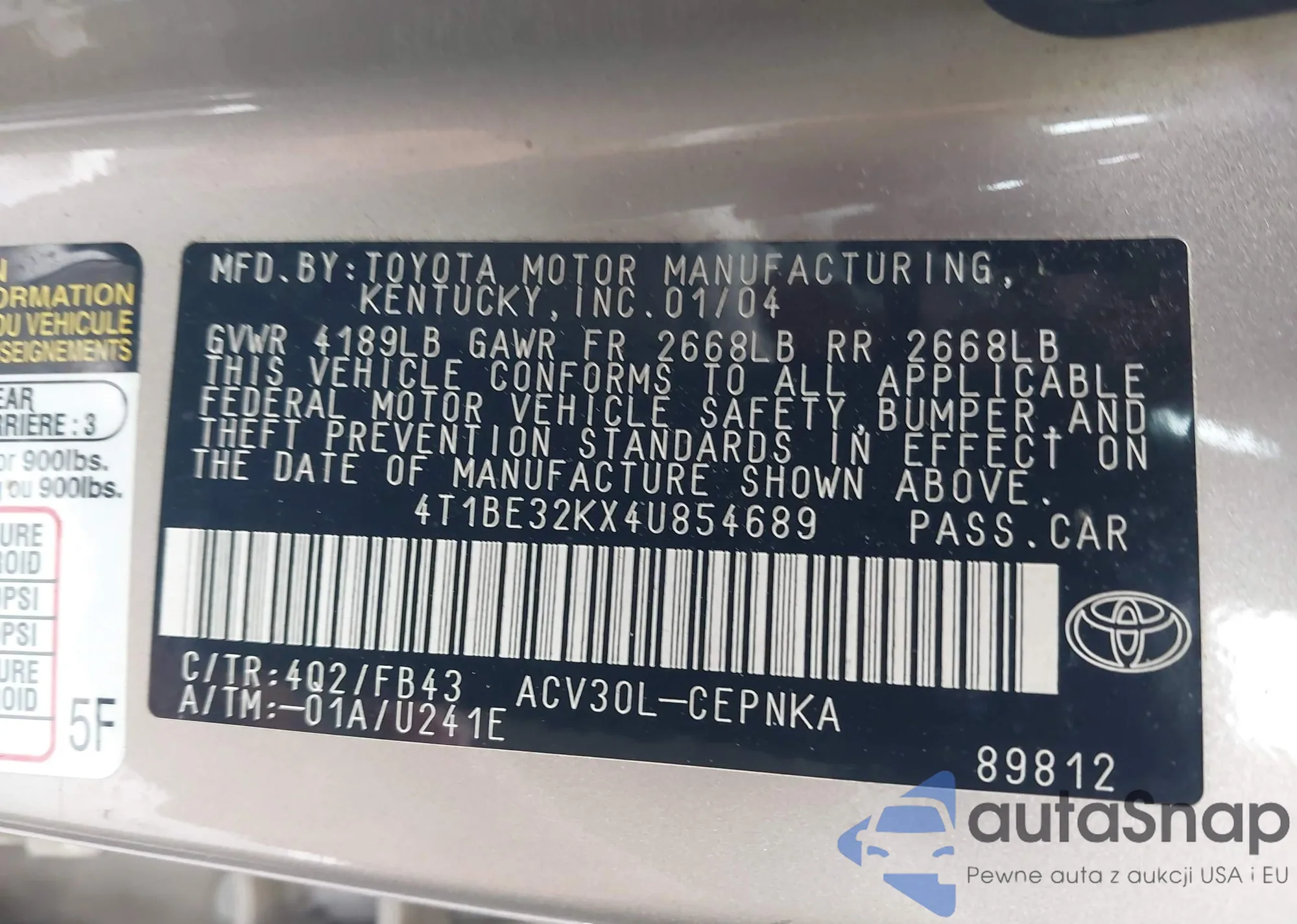 • VIN 4T1BE32KX4U854689