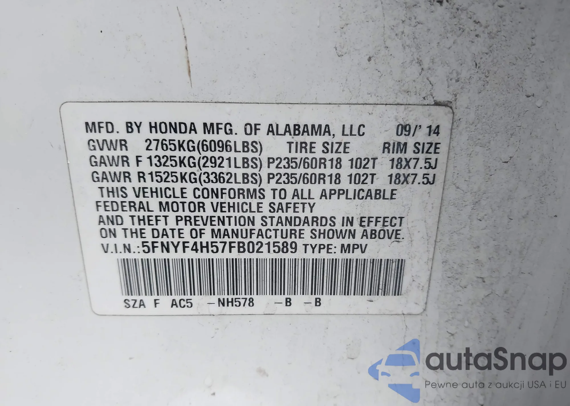 • VIN 5FNYF4H57FB021589