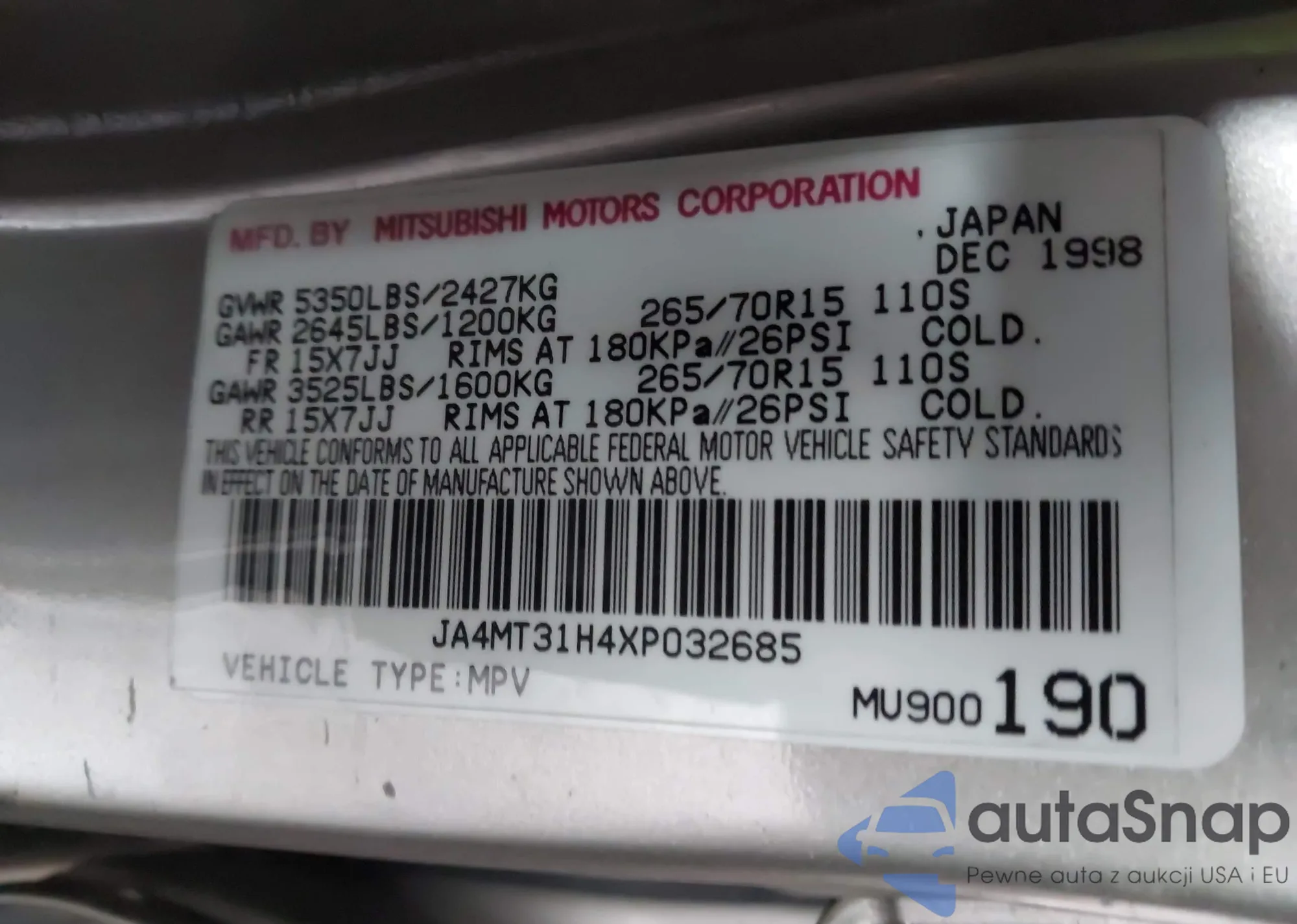 LOT: 44057774 VIN: JA4MT31H4XP032685