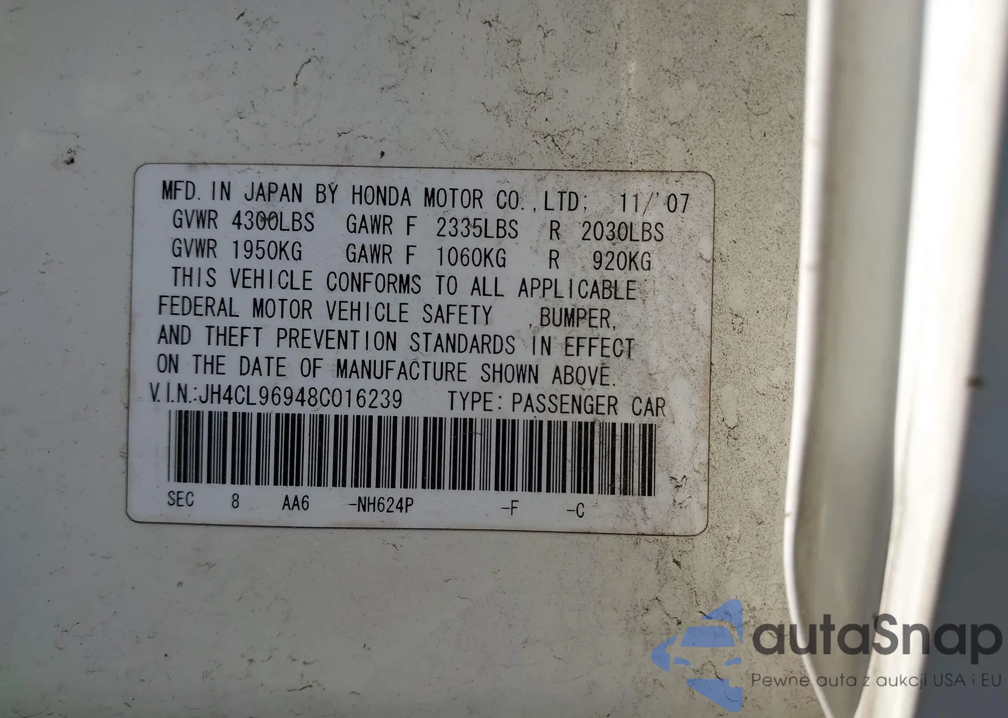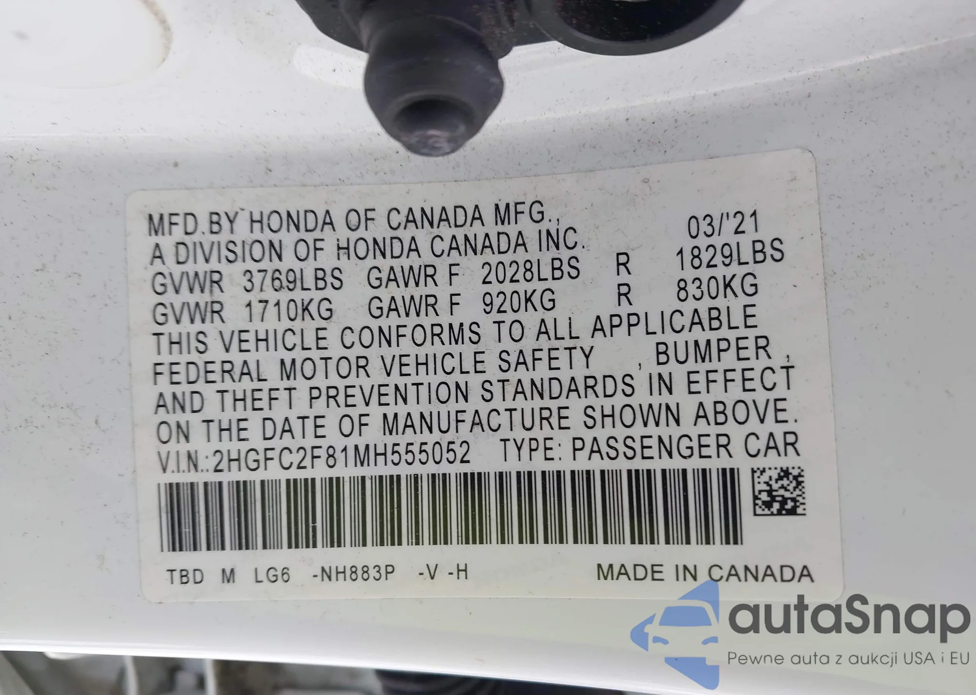 LOT: 43823768 VIN: 2HGFC2F81MH555052