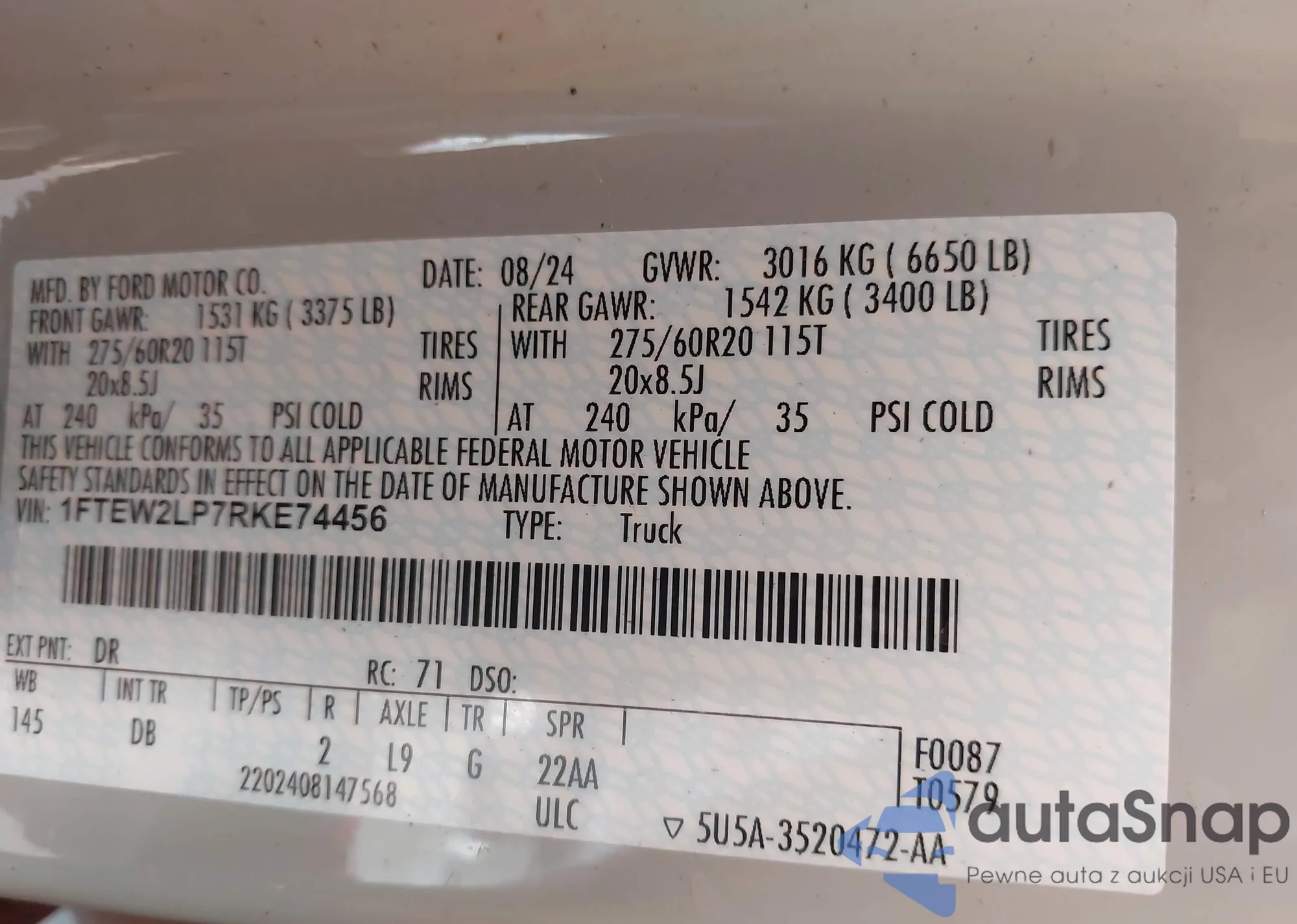 • VIN 1FTEW2LP7RKE74456