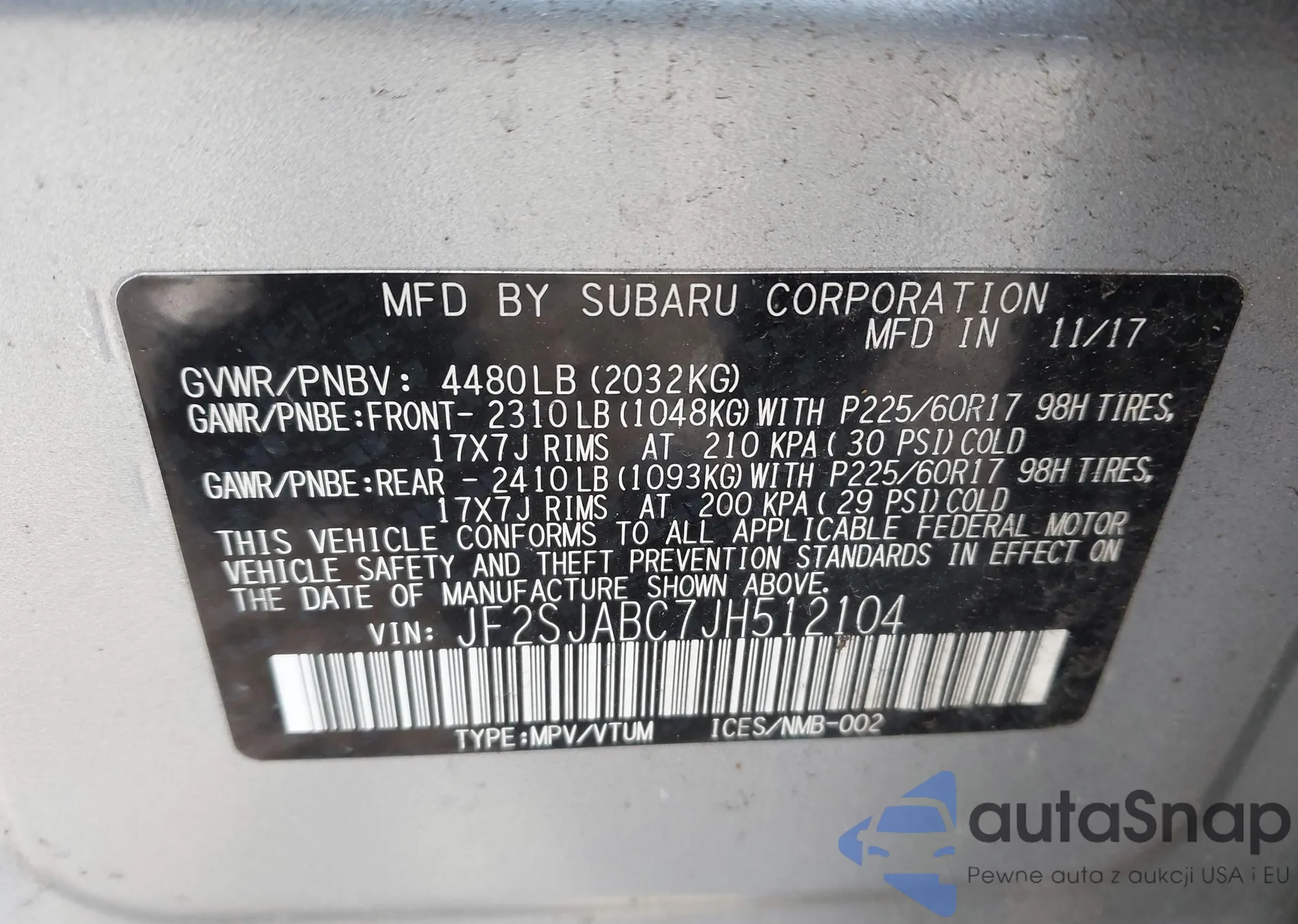 LOT: 44053965 VIN: JF2SJABC7JH512104