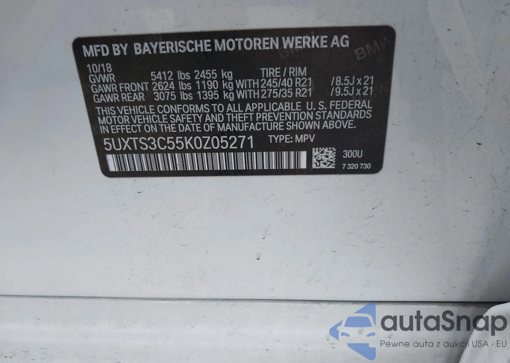 LOT: 43695193 VIN: 5UXTS3C55K0Z05271
