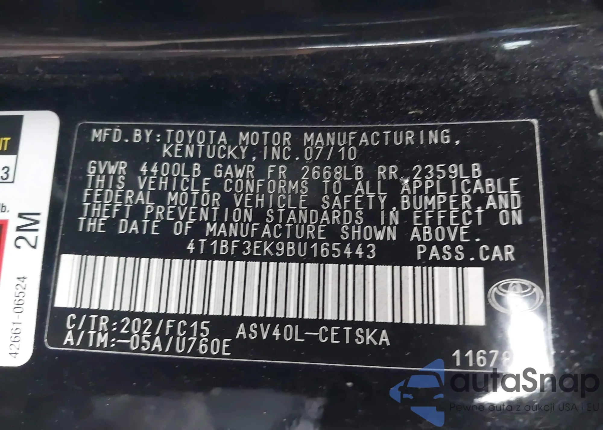 • VIN 4T1BF3EK9BU165443