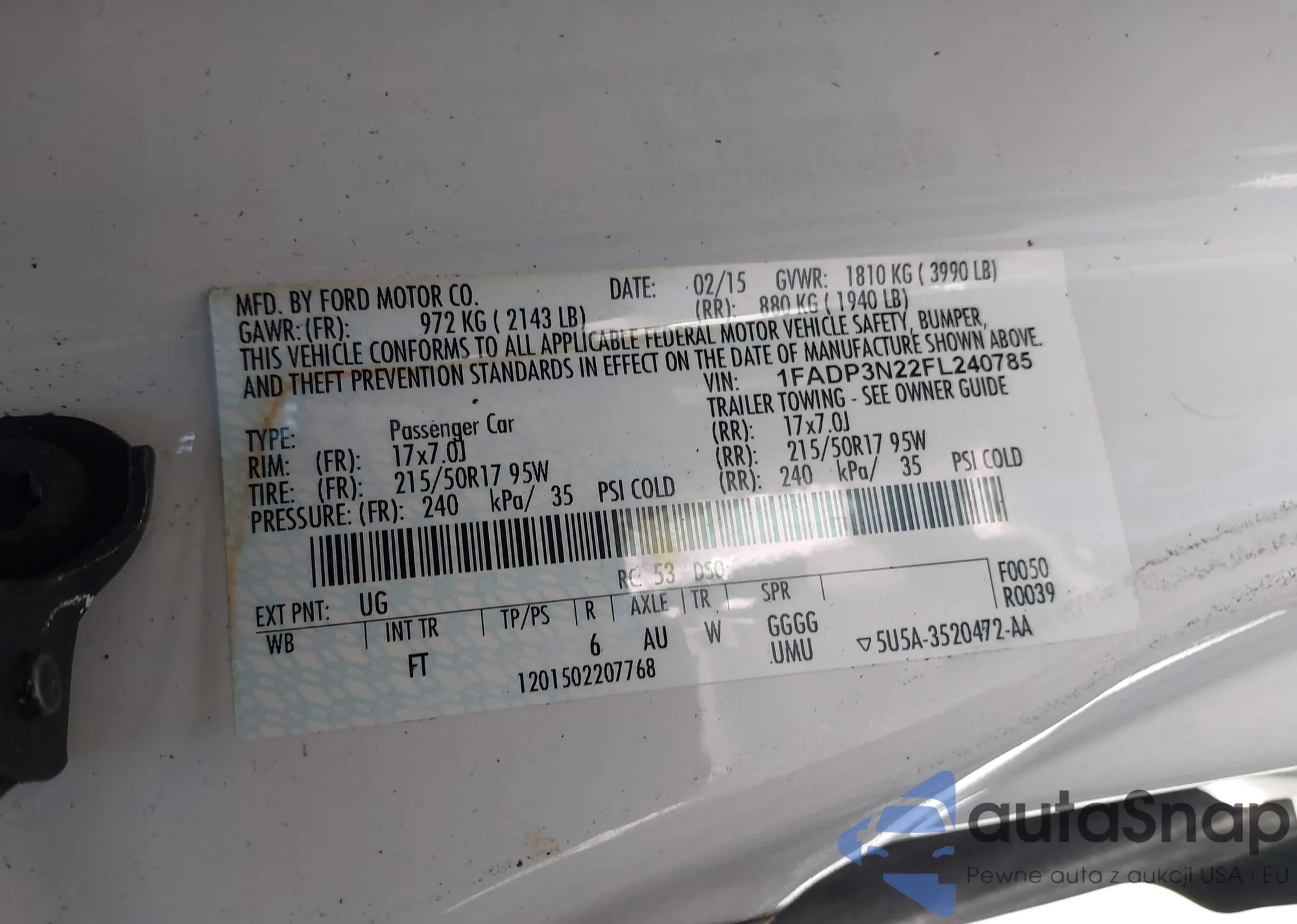• VIN 1FADP3N22FL240785