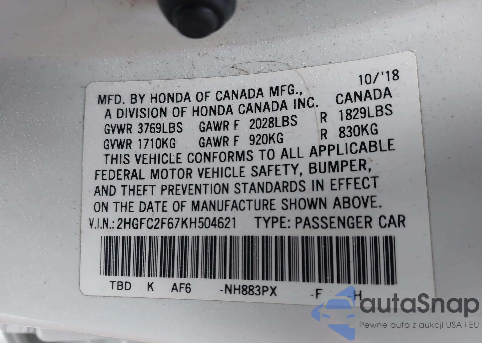 • VIN 2HGFC2F67KH504621
