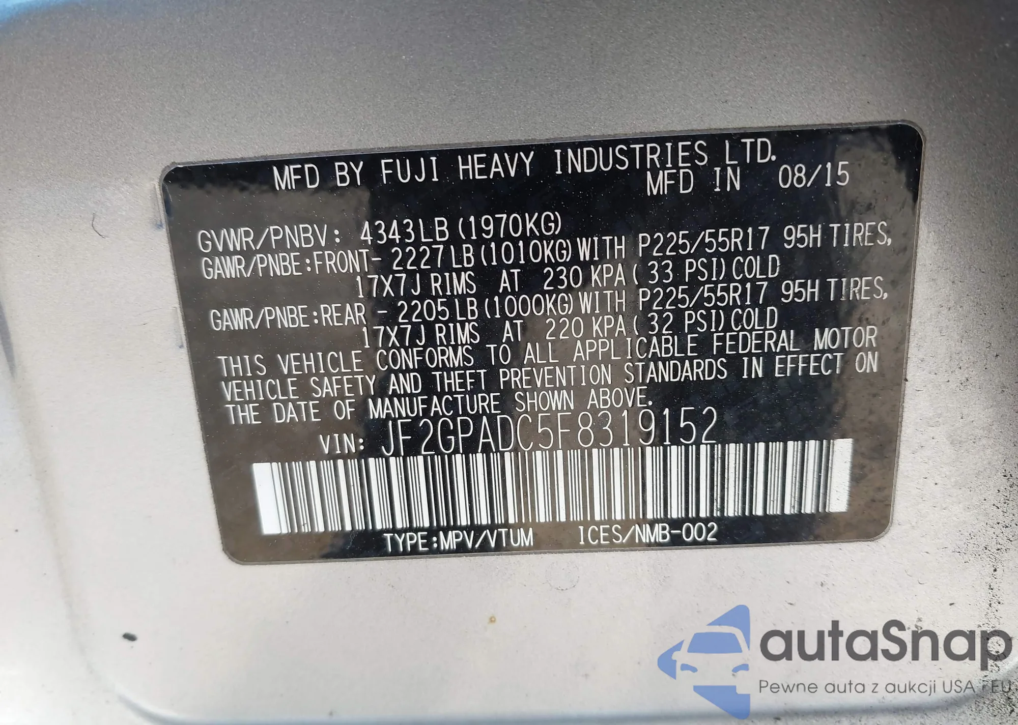 LOT: 43870225 VIN: JF2GPADC5F8319152