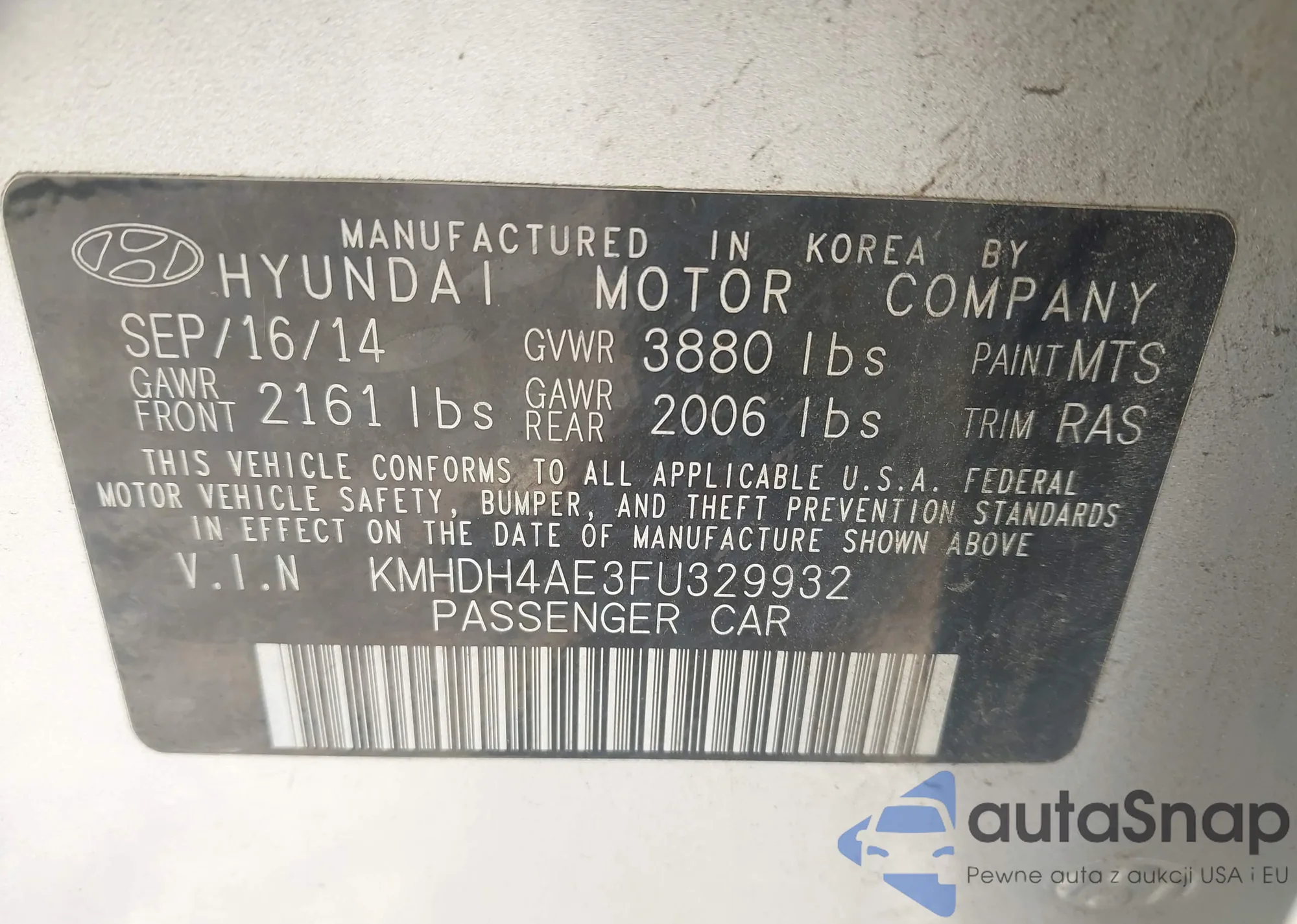 LOT: 43074370 VIN: KMHDH4AE3FU329932