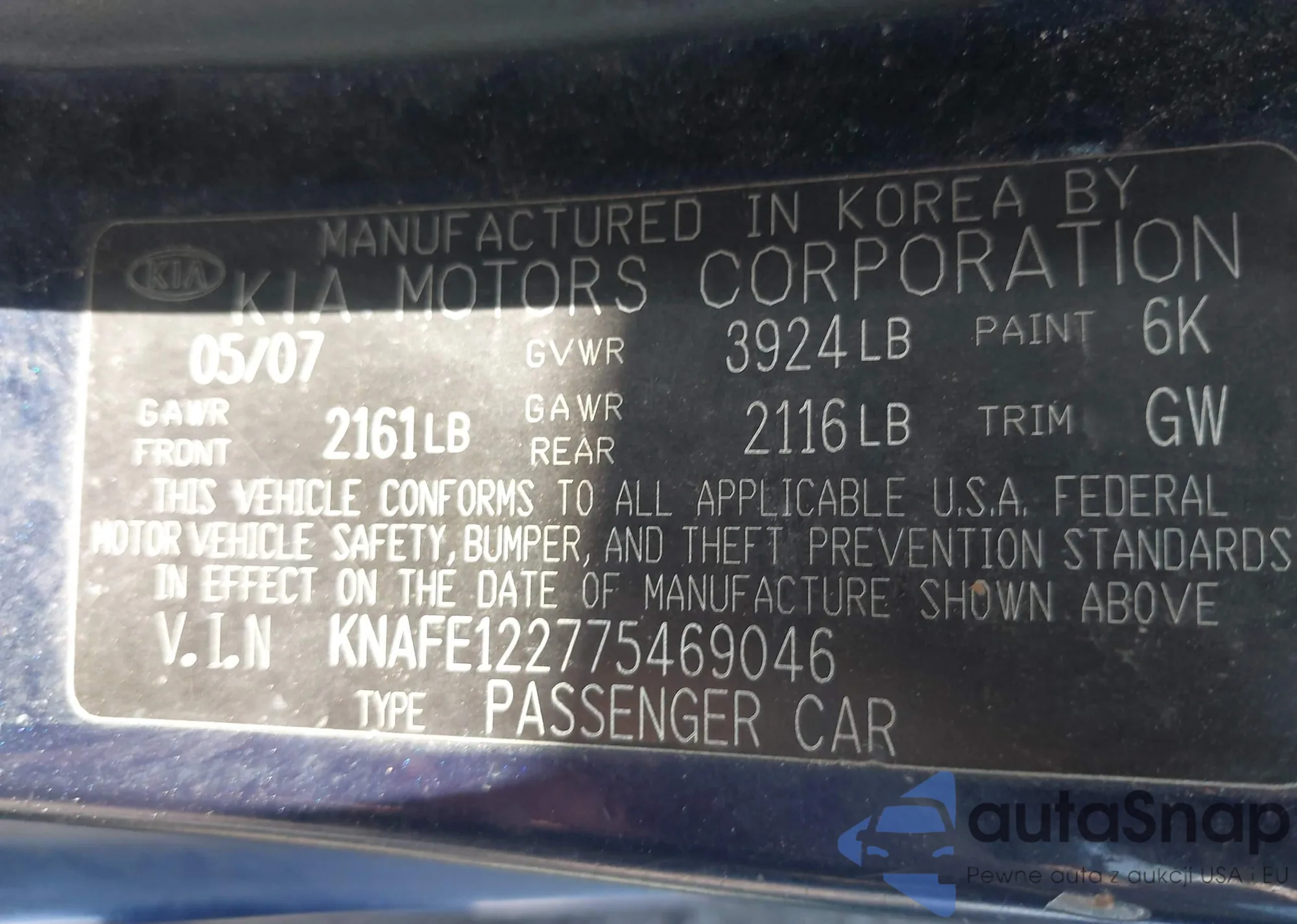 2007 Kia Spectra Ex z USA, uszkodzony, nr VIN KNAFE122775469046