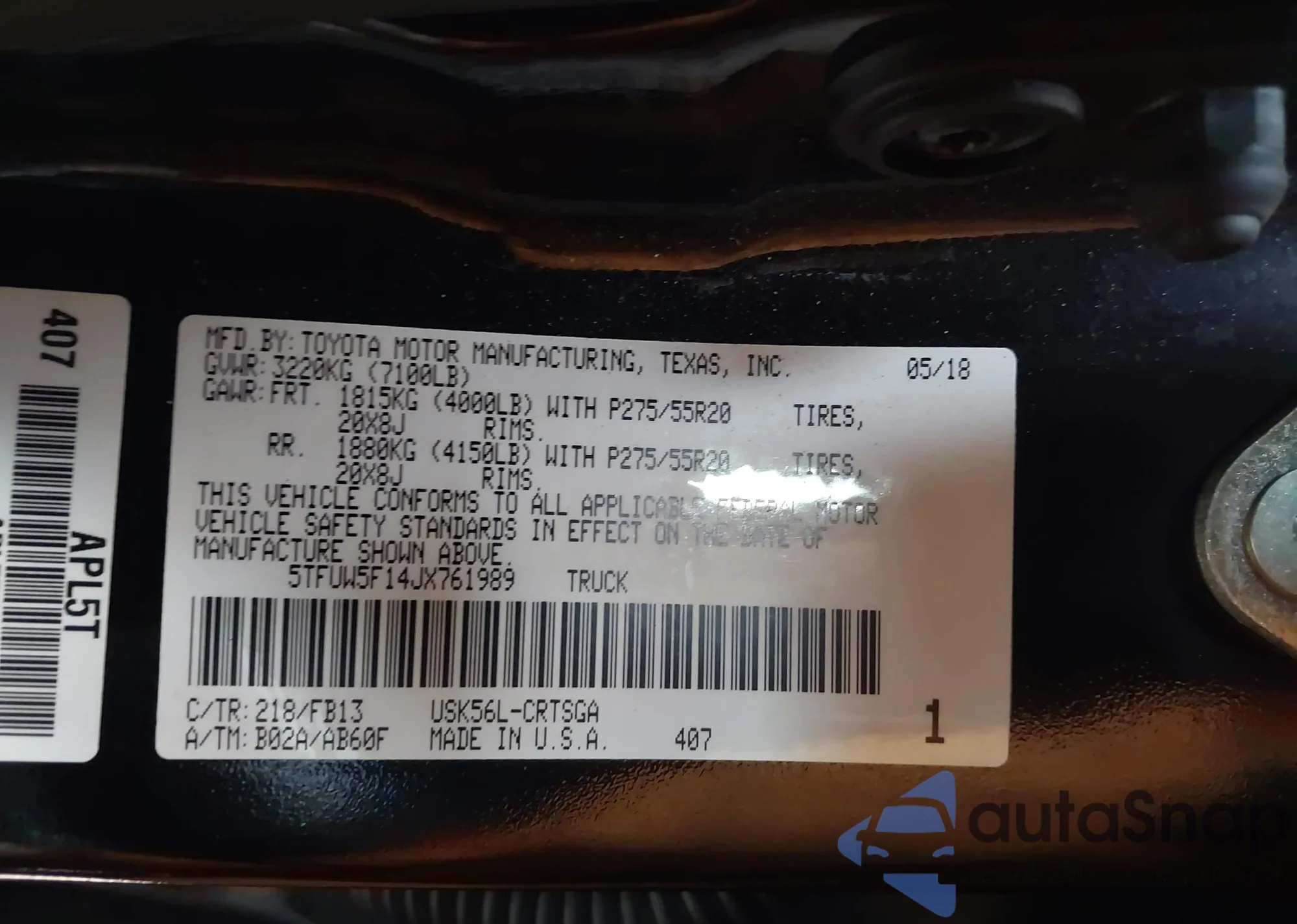 LOT: 43748259 VIN: 5TFUW5F14JX761989
