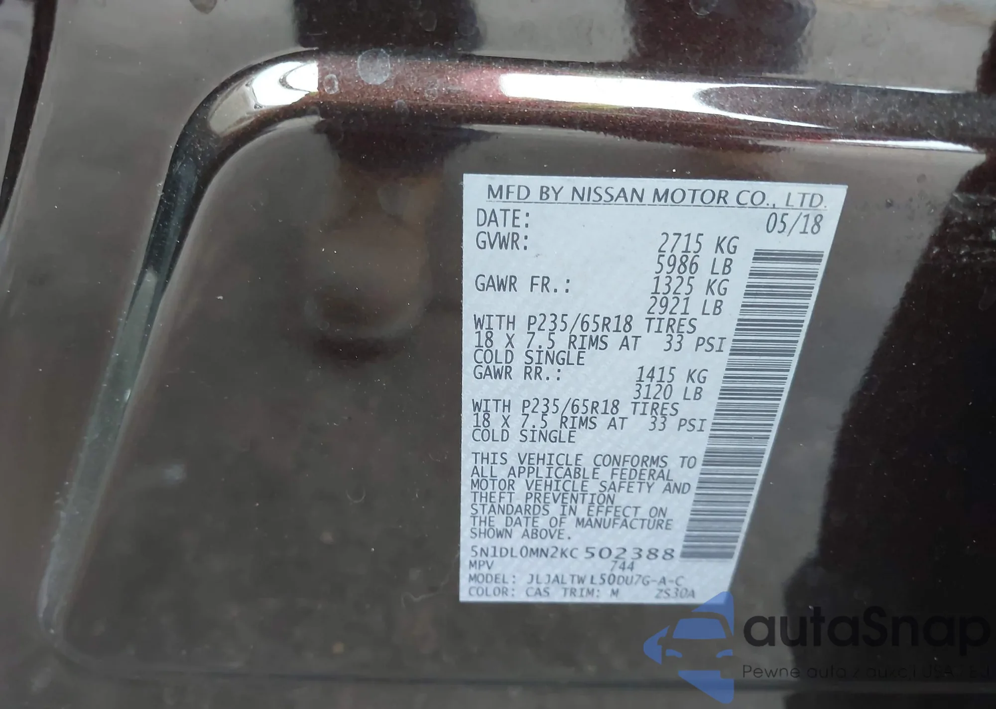 LOT: 43954087 VIN: 3N1CP5CU0JL527158