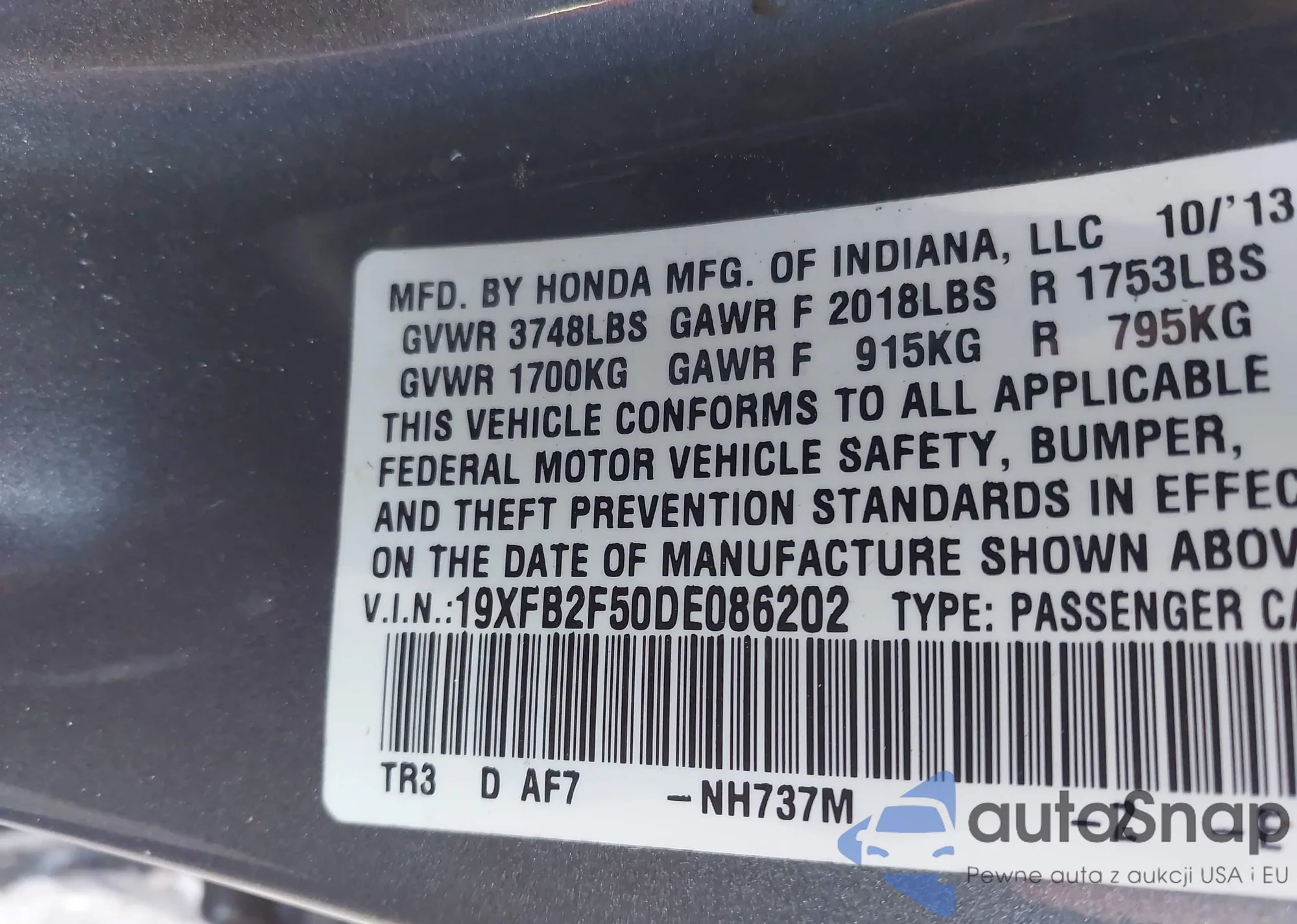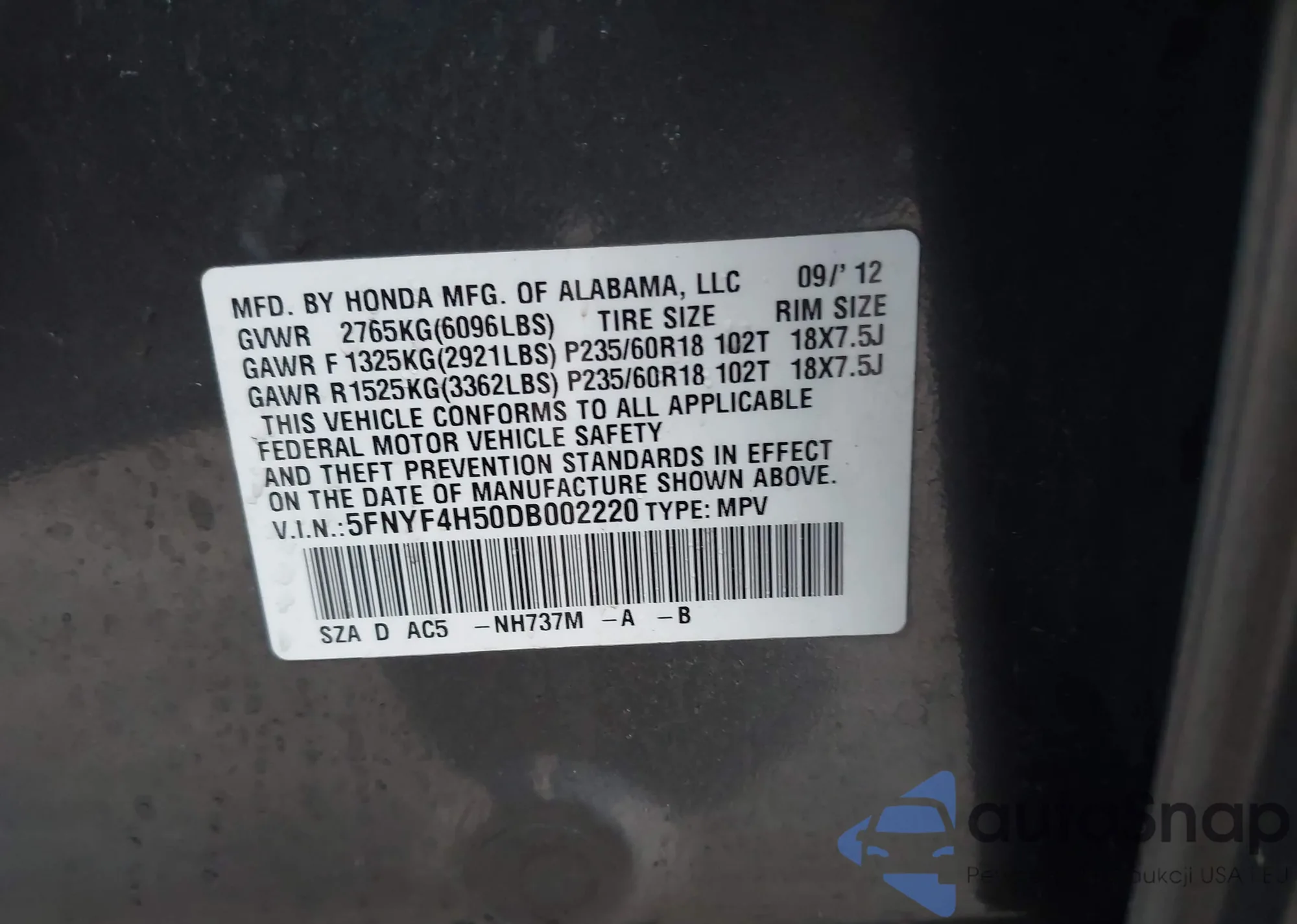 • VIN 5FNYF4H50DB002220