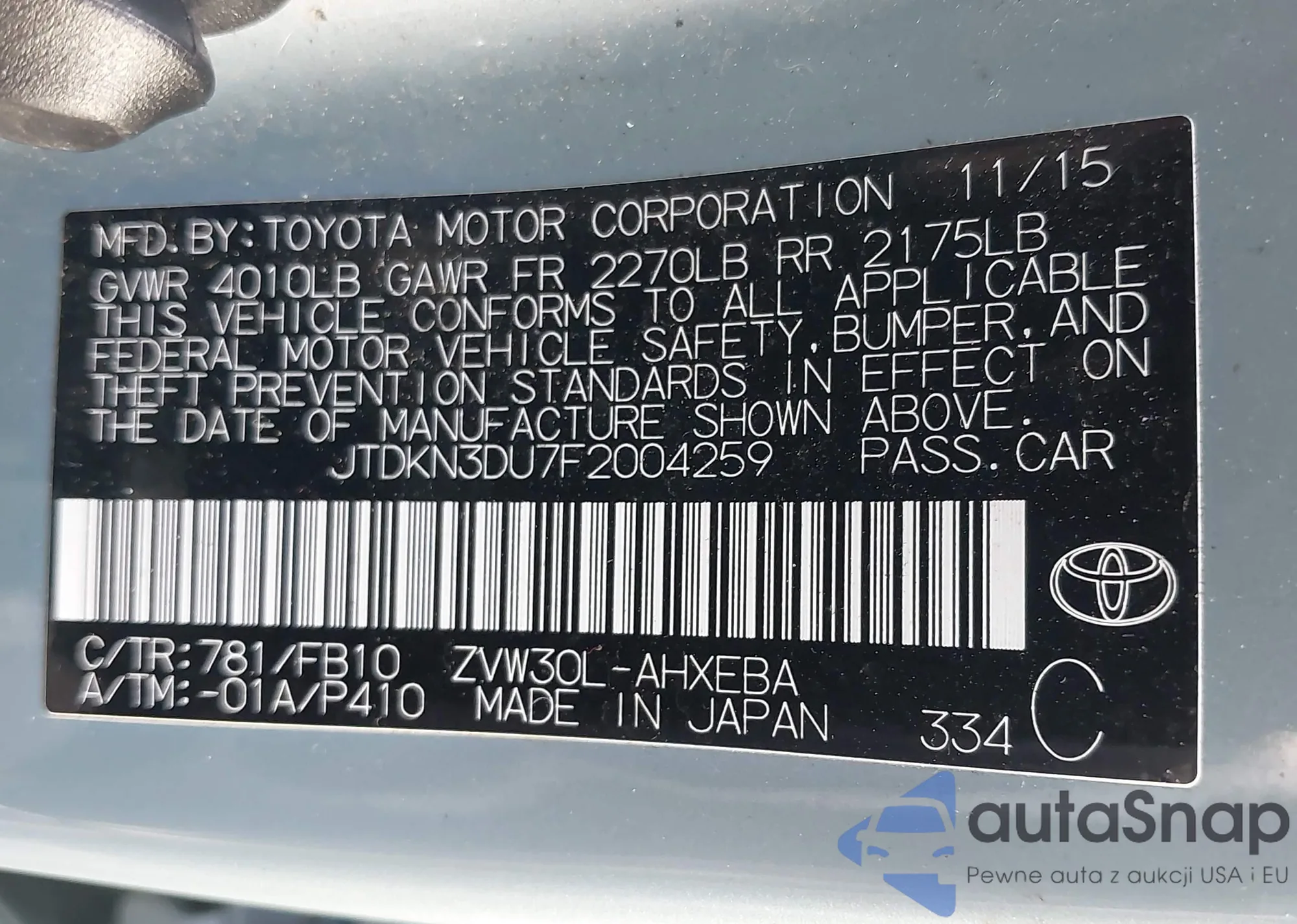 LOT: 43811964 VIN: JTDKN3DU7F2004259