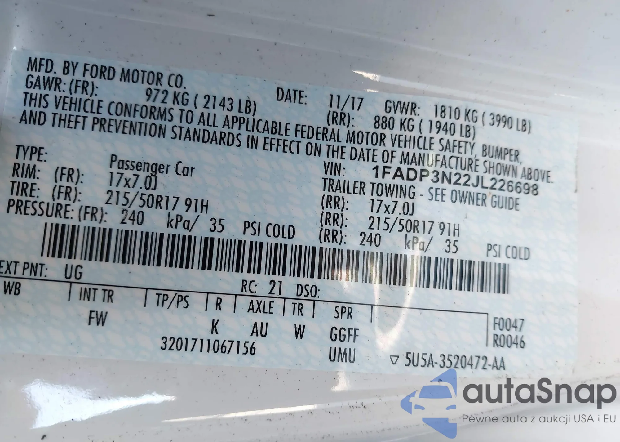 • VIN 1FADP3N22JL226698
