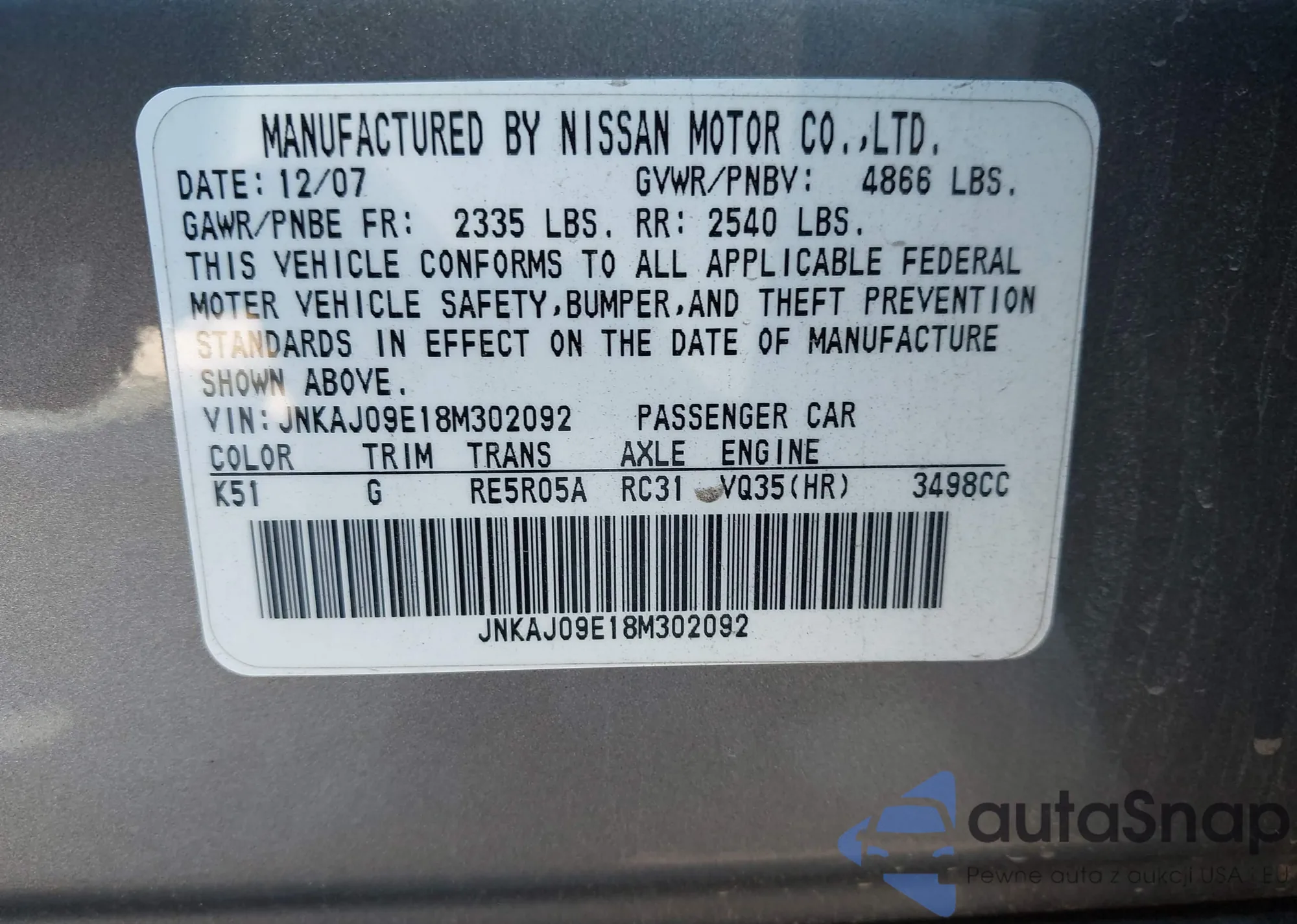 • VIN 5N1AZ2BJ4MC110481
