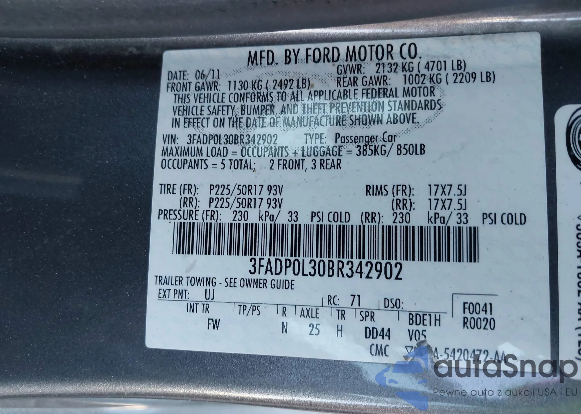 LOT: 43911246 VIN: 3FADP0L30BR342902