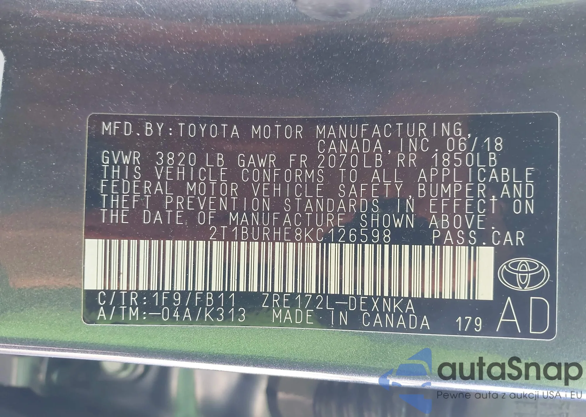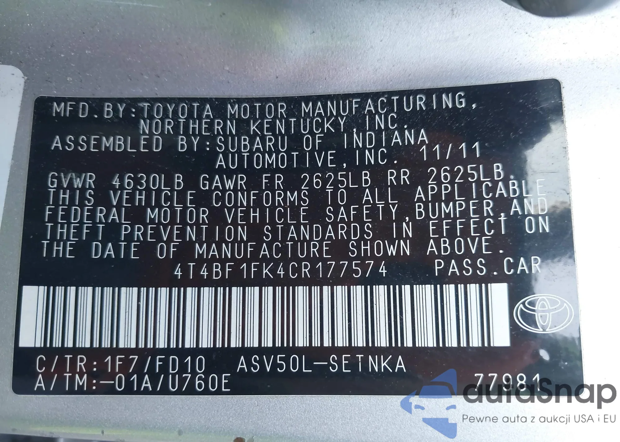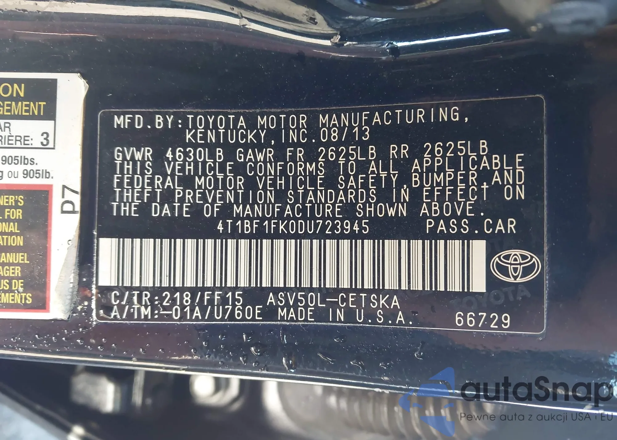 • VIN 4T1BF1FK0DU723945