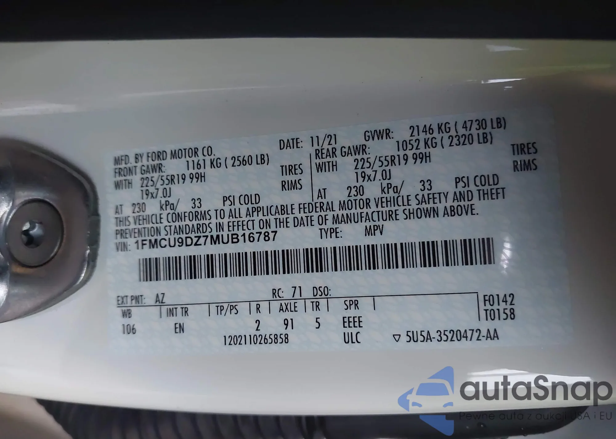 • VIN 1FMCU9DZ7MUB16787