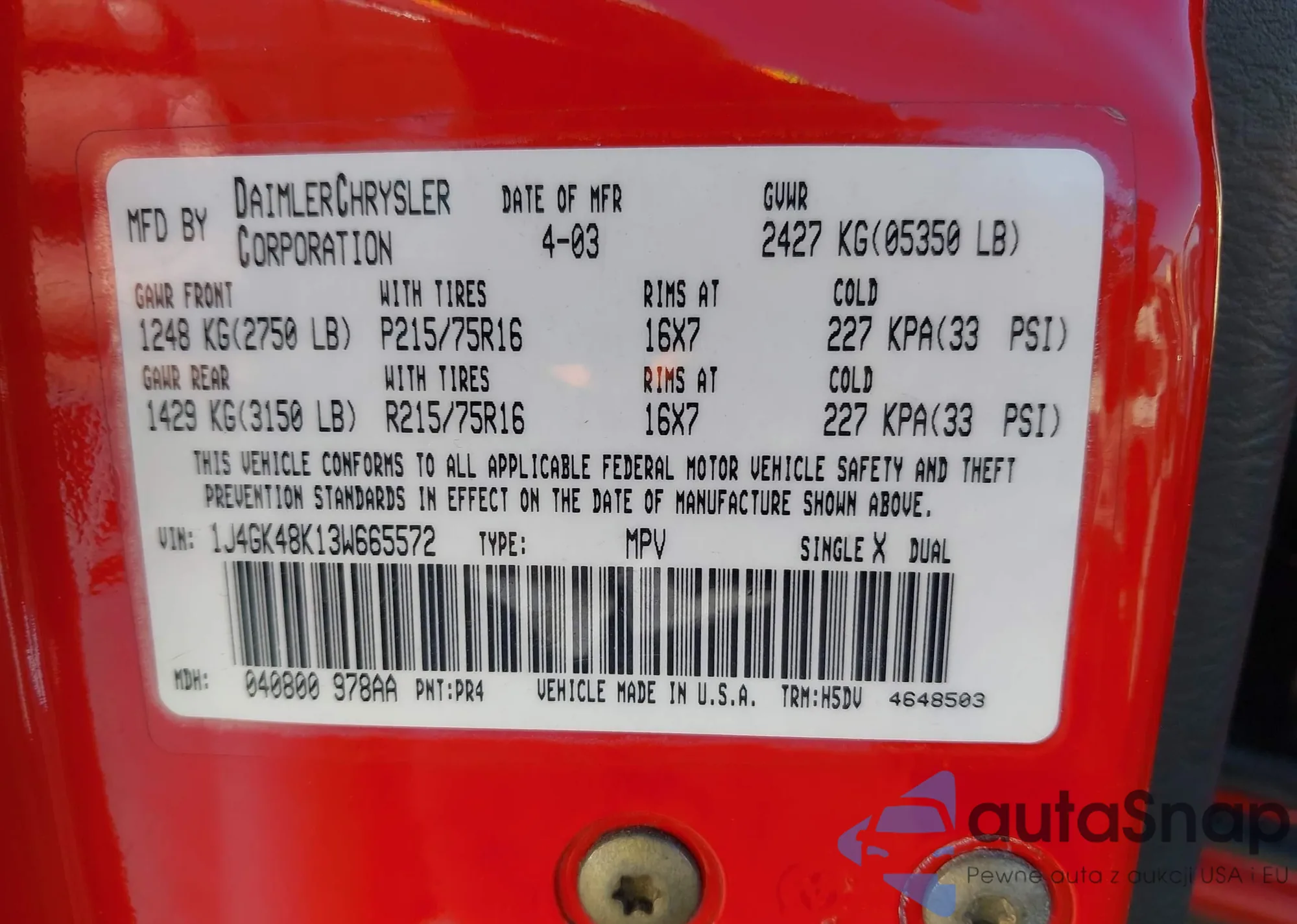 LOT: 43900537 VIN: 1J4GK48K13W665572