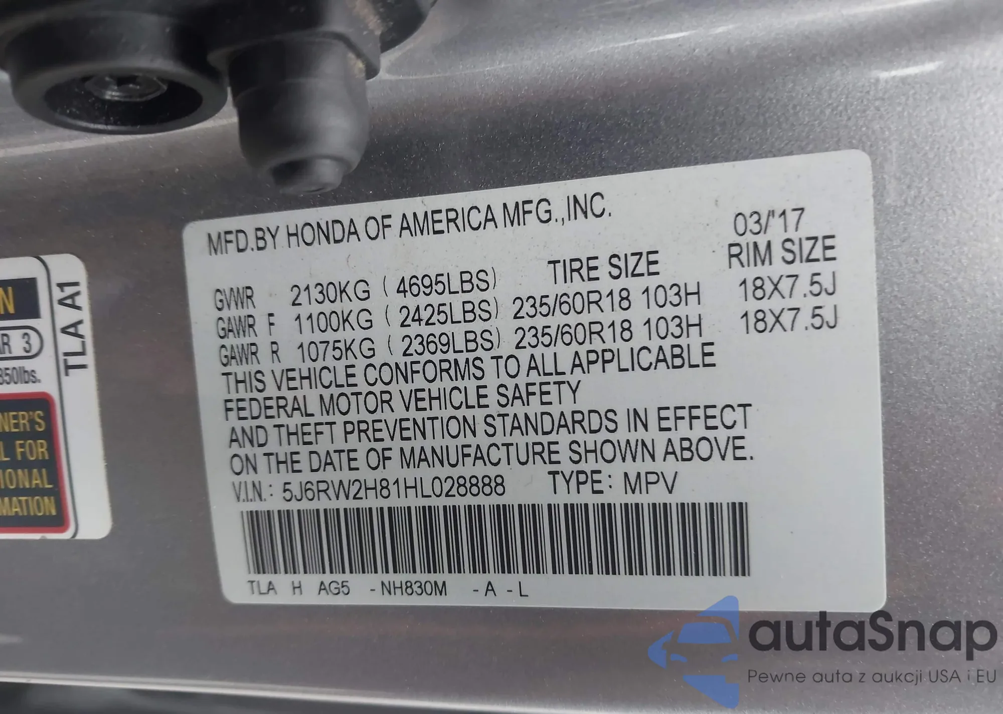 • VIN 5J6RW2H81HL028888