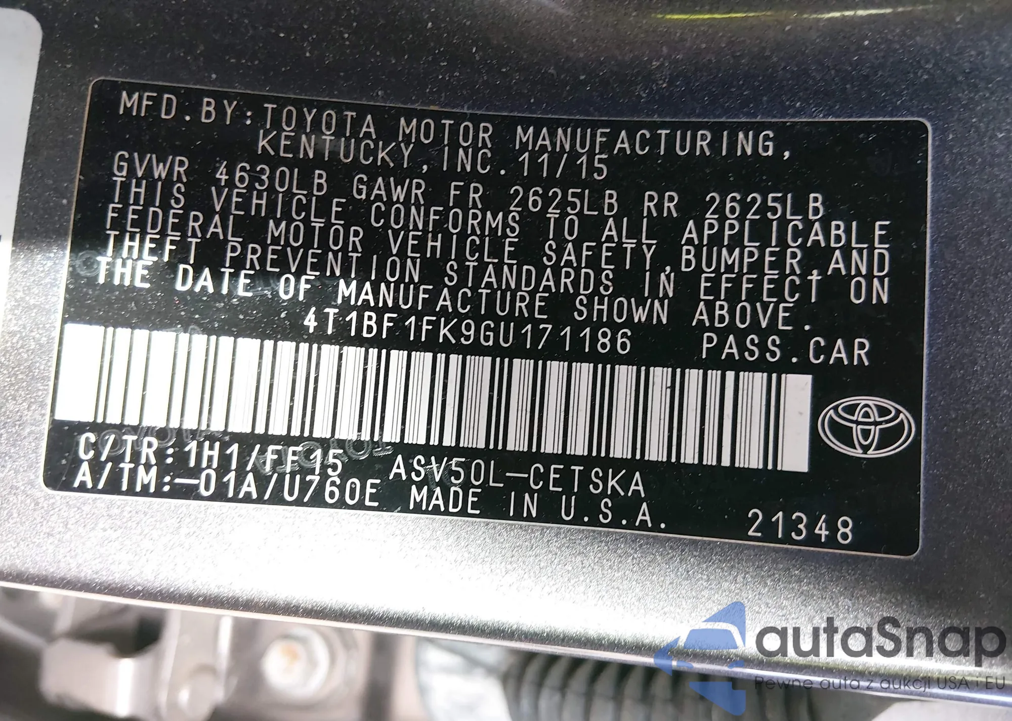 • VIN 4T1BF1FK9GU171186