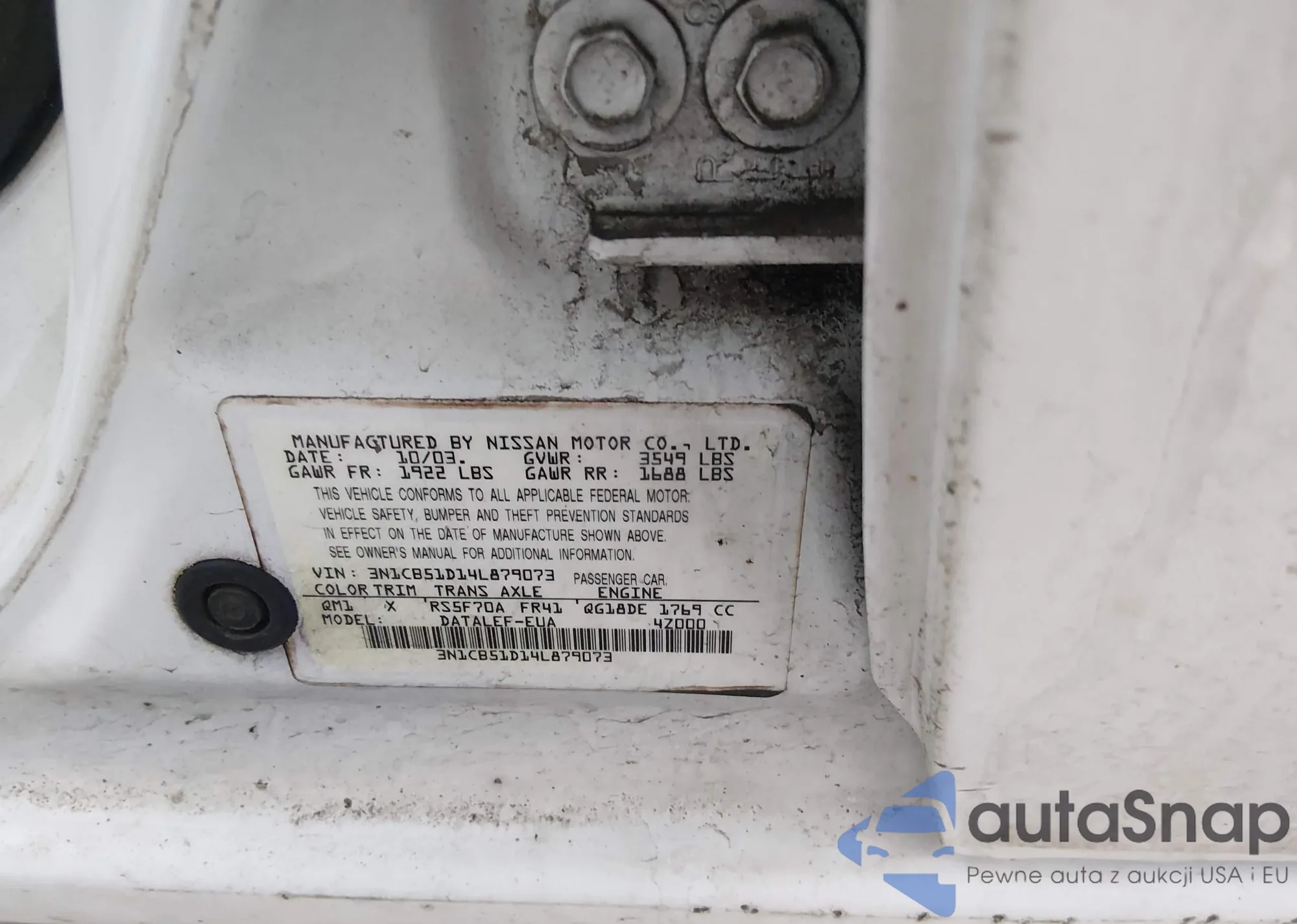 2004 Nissan Sentra 1.8S z USA, uszkodzony, nr VIN 3N1CB51D14L879073