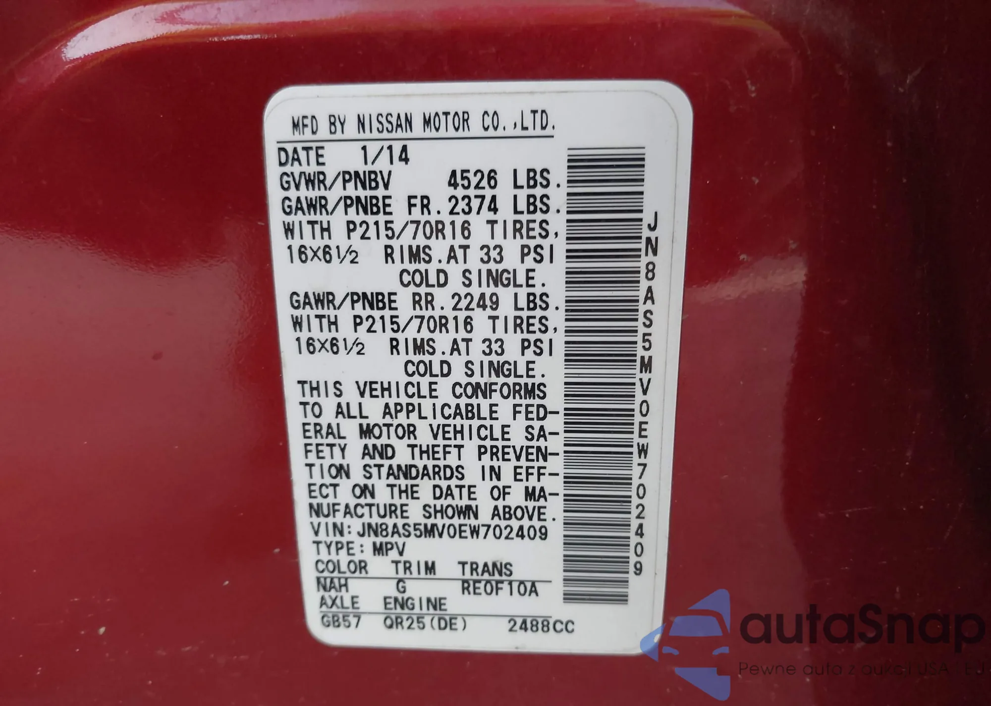 LOT: 43984388 VIN: JN8AS5MV0EW702409