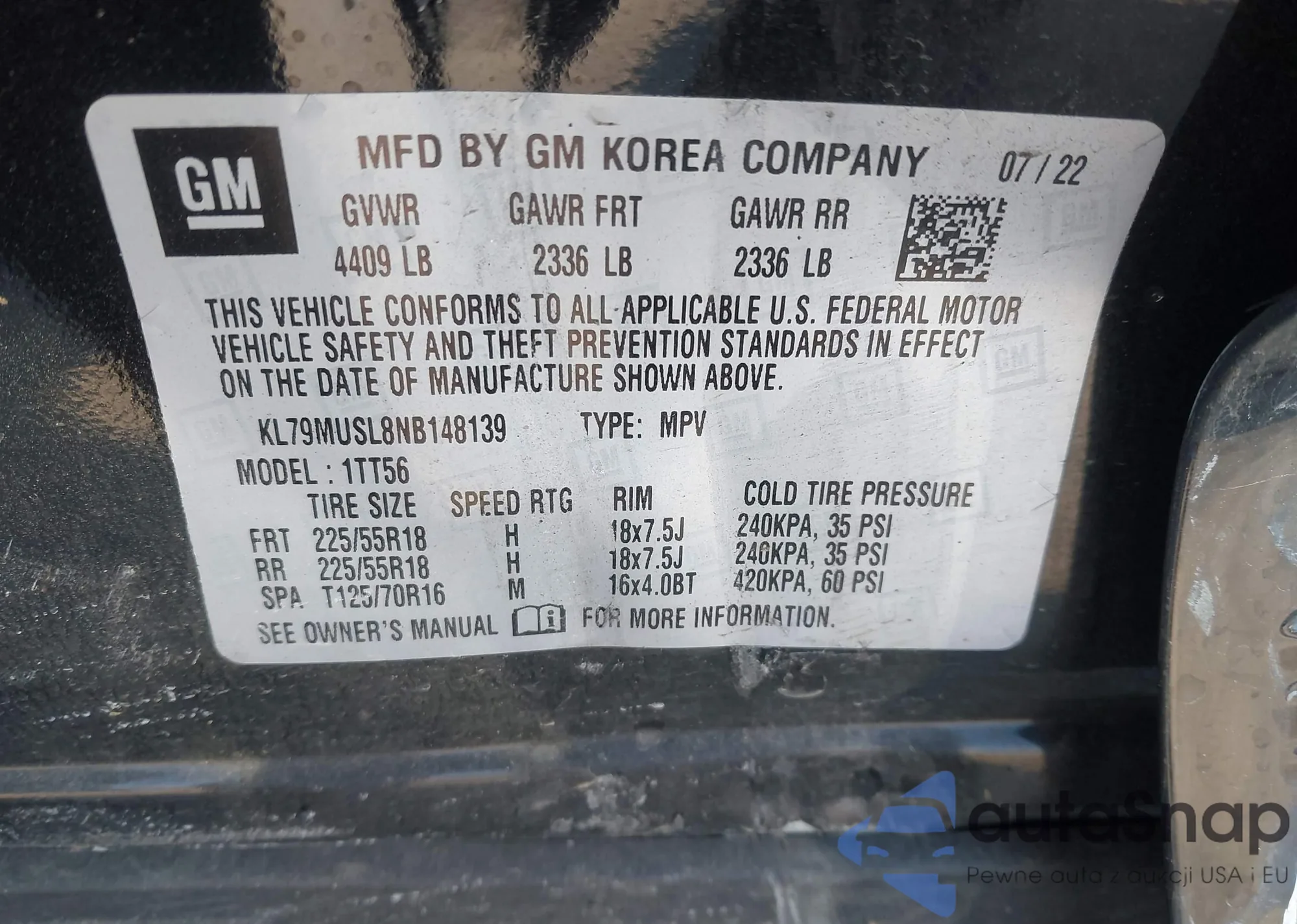• VIN KL79MUSL8NB148139