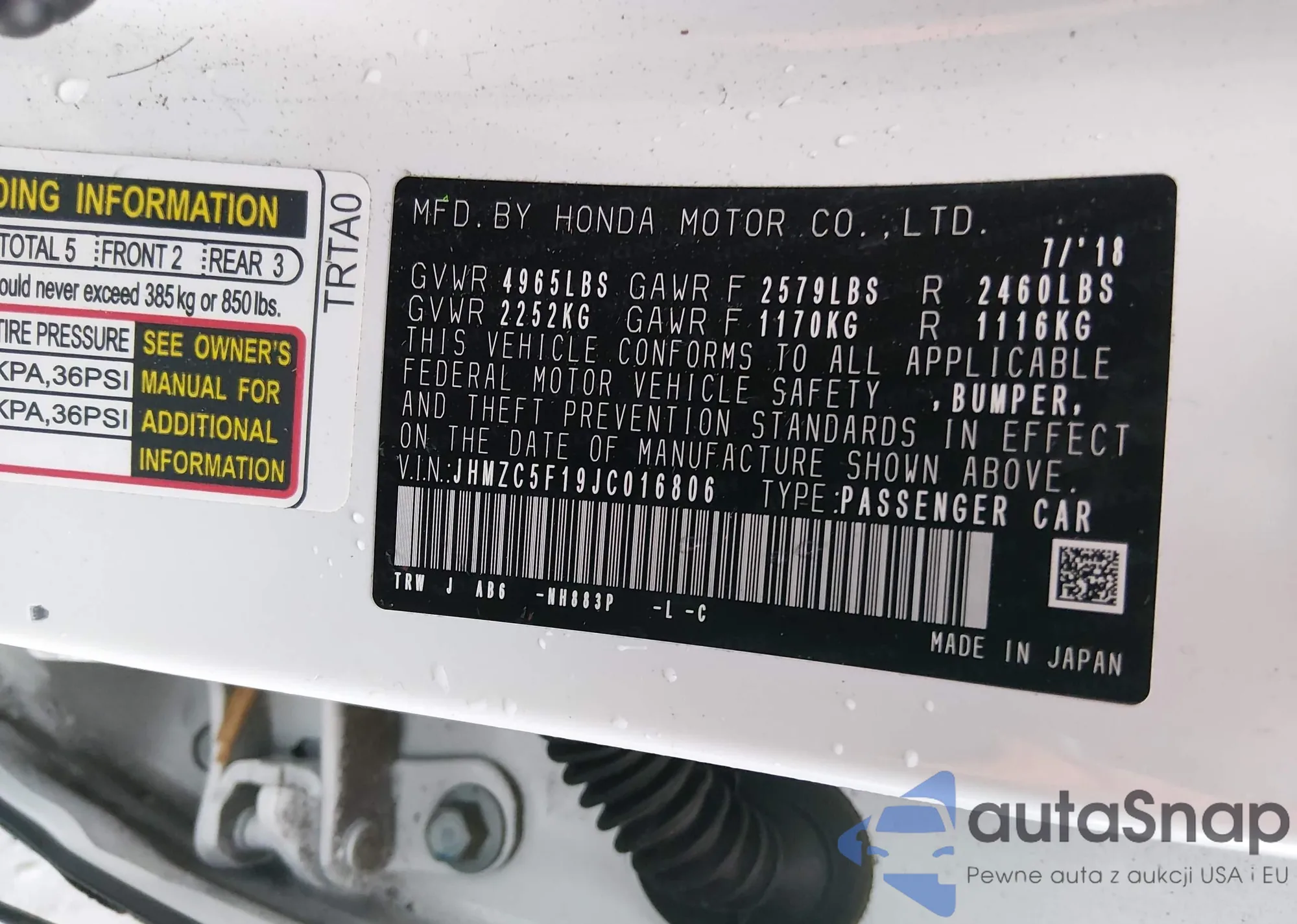 LOT: 44002370 VIN: JHMZC5F19JC016806