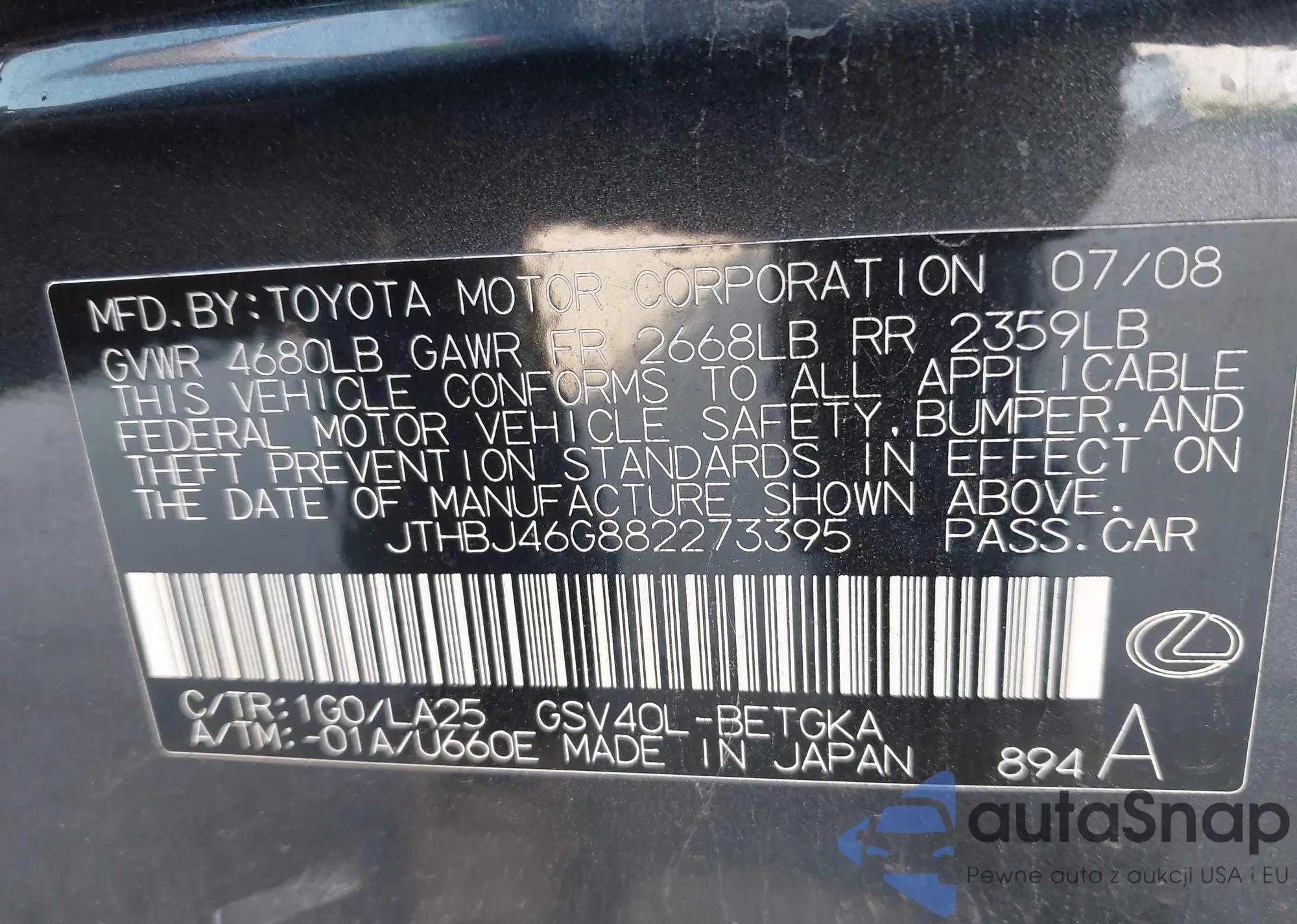 LOT: 43347468 VIN: 1HGCR3F85DA019338