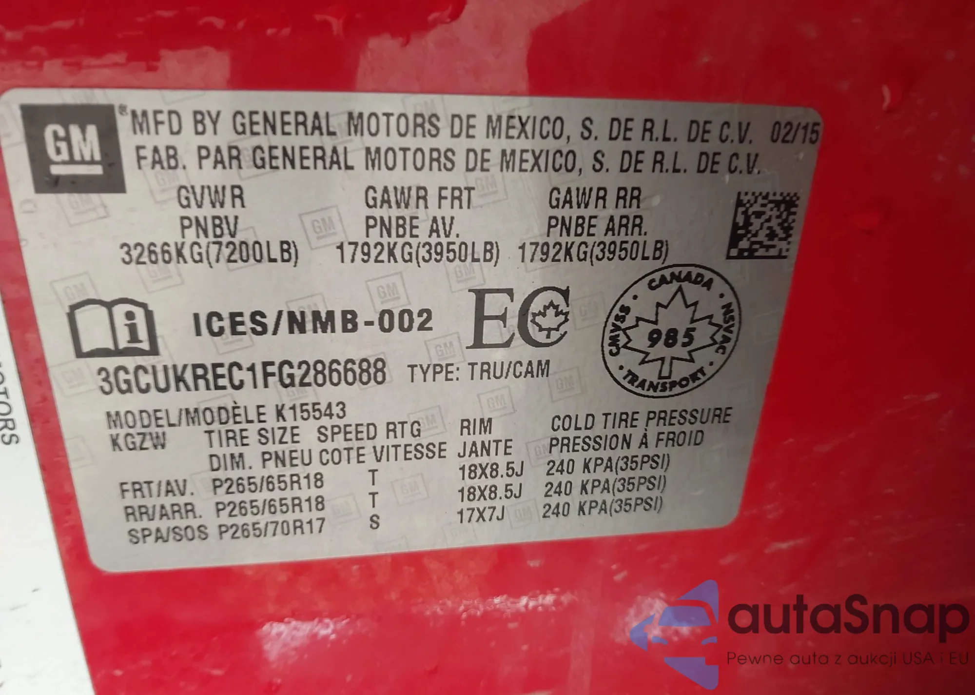 LOT: 43128007 VIN: 3GCUKREC1FG286688