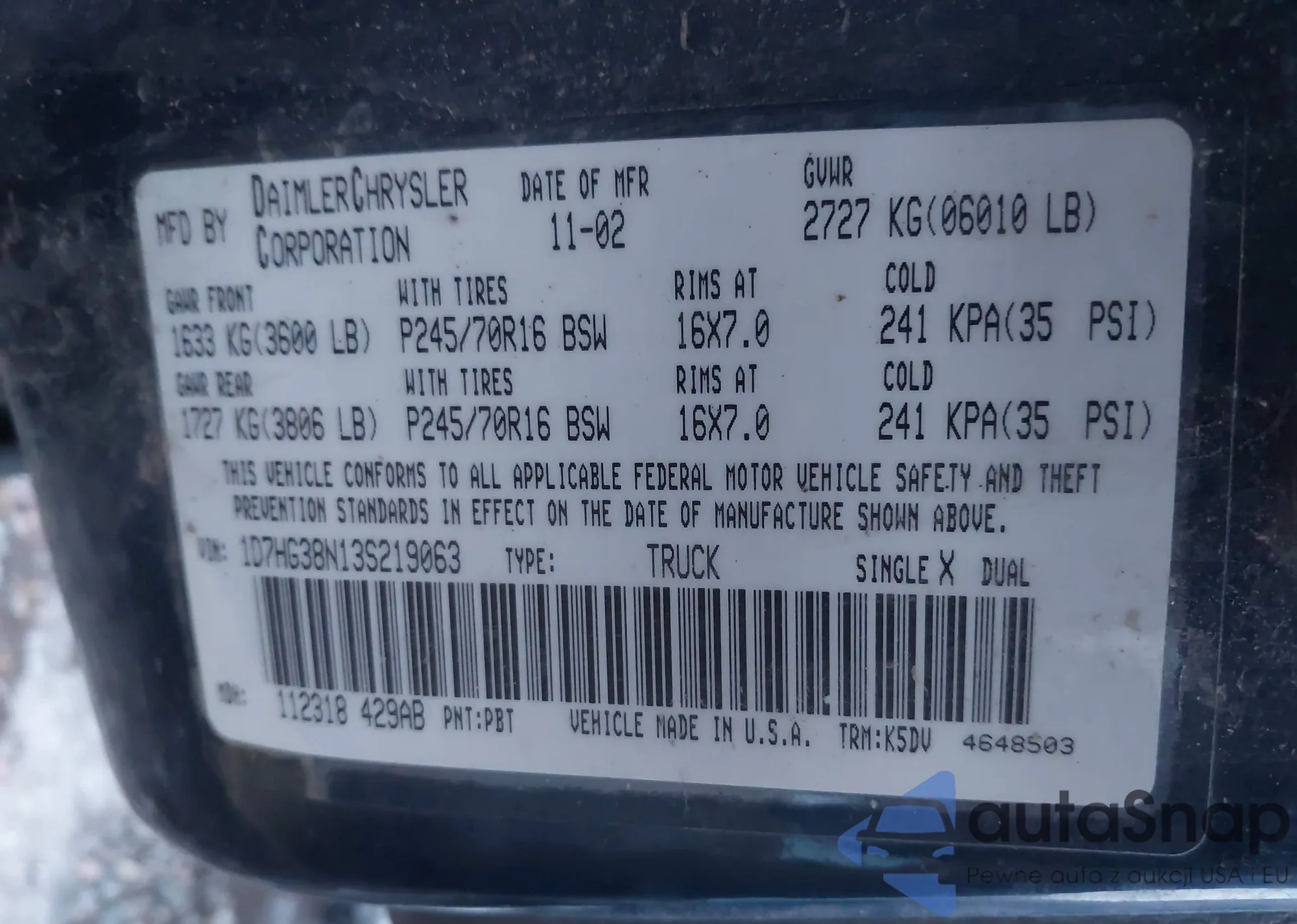 • VIN 1D7HG38N13S219063