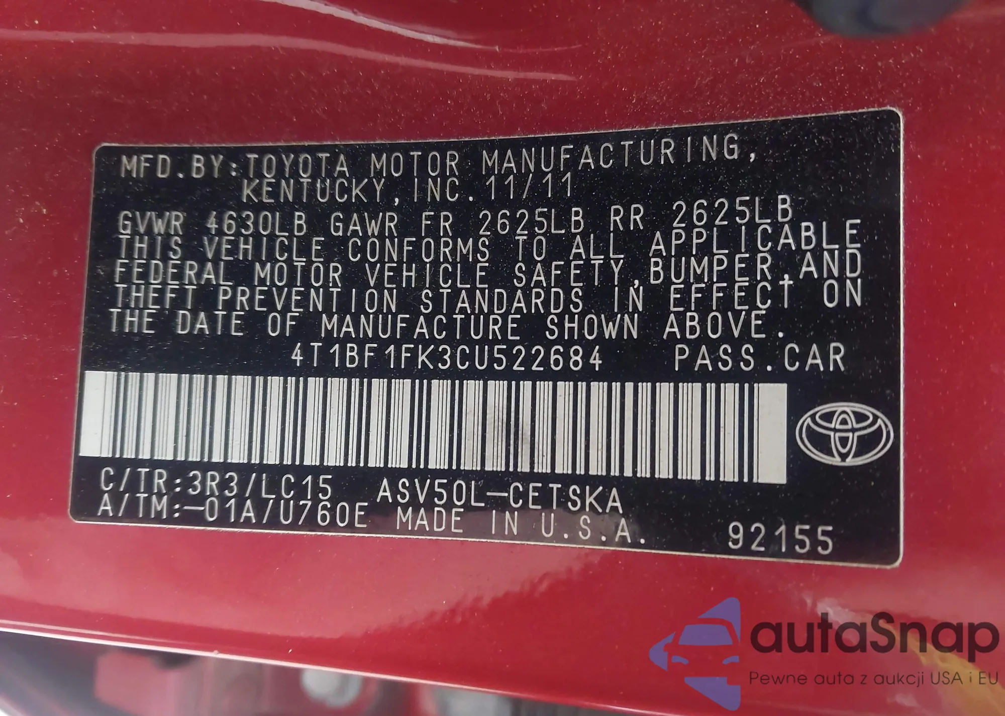 • VIN 4T1BF1FK3CU522684