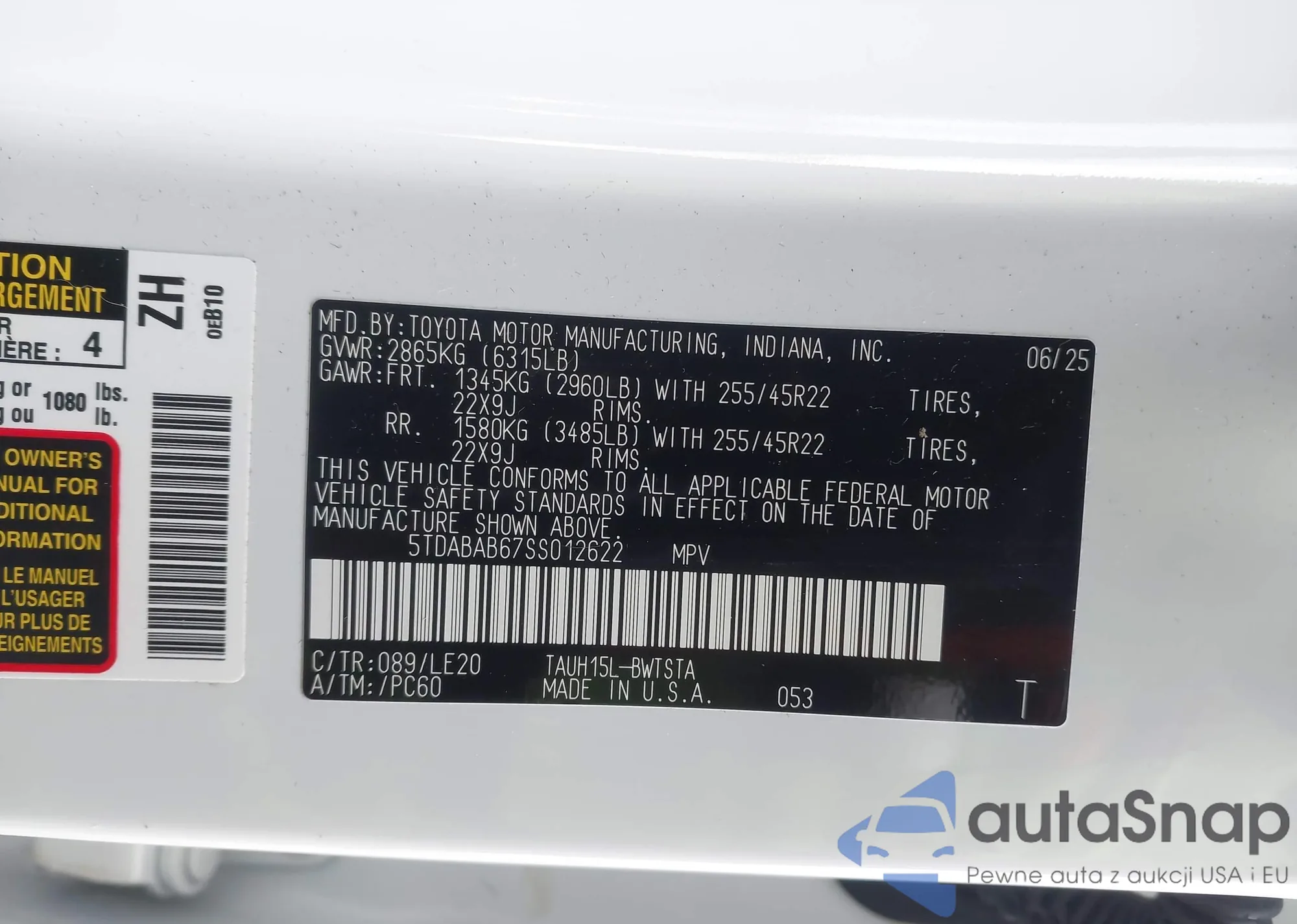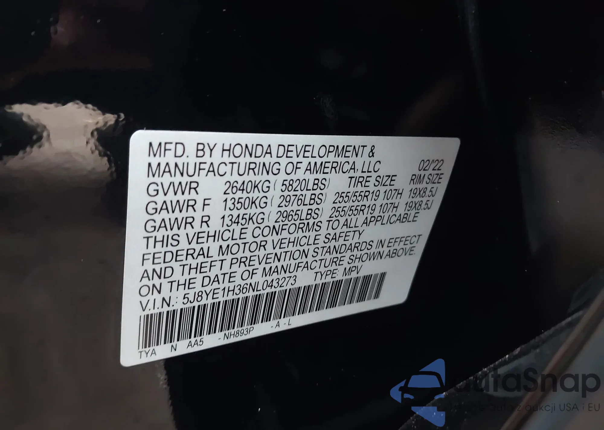 • VIN 5J8YE1H36NL043273