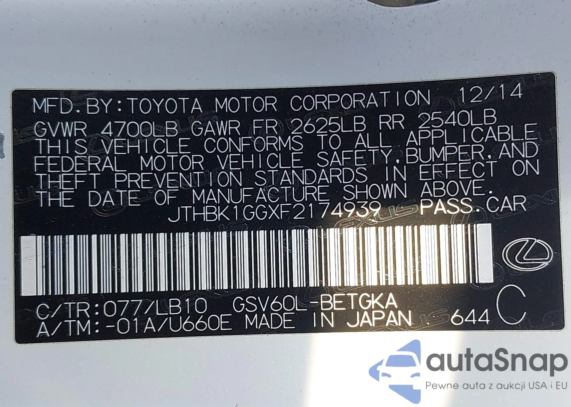 LOT: 43678627 VIN: JTHBJ46G882270898