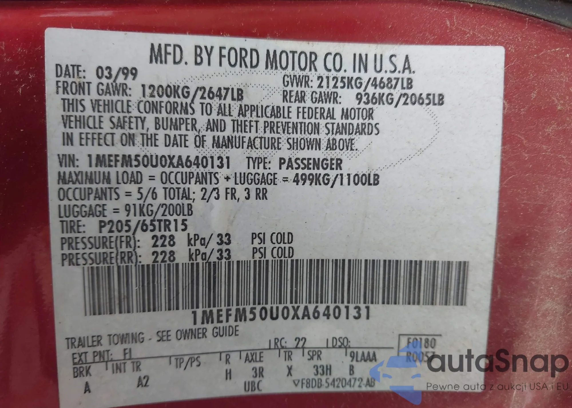 LOT: 43647436 VIN: 1MEFM50U0XA640131