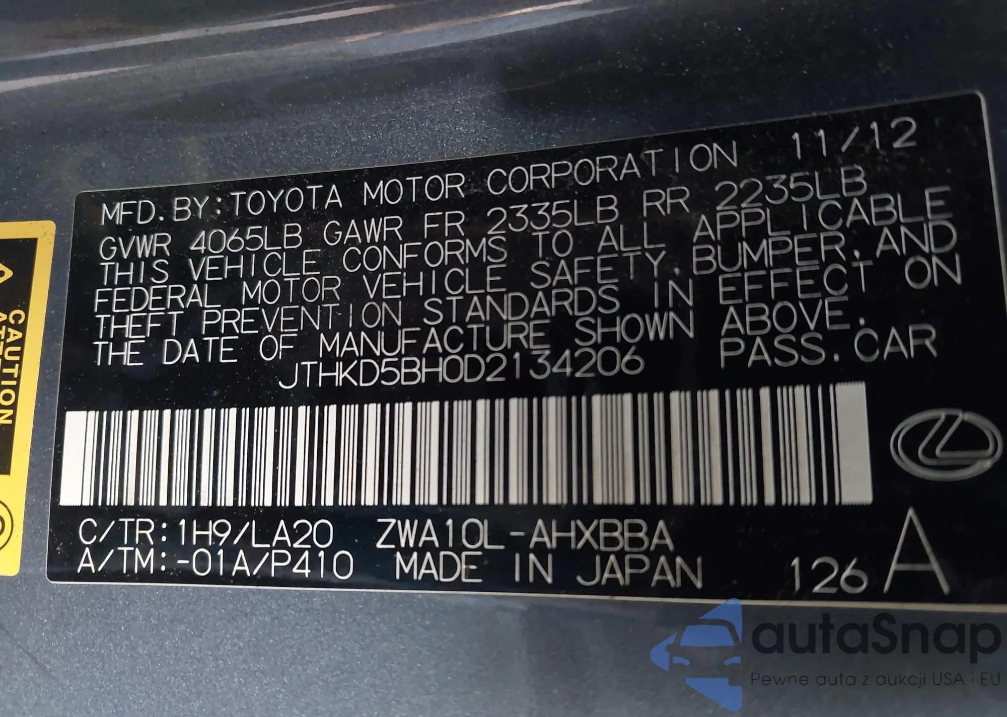• VIN JTHKD5BH0D2134206