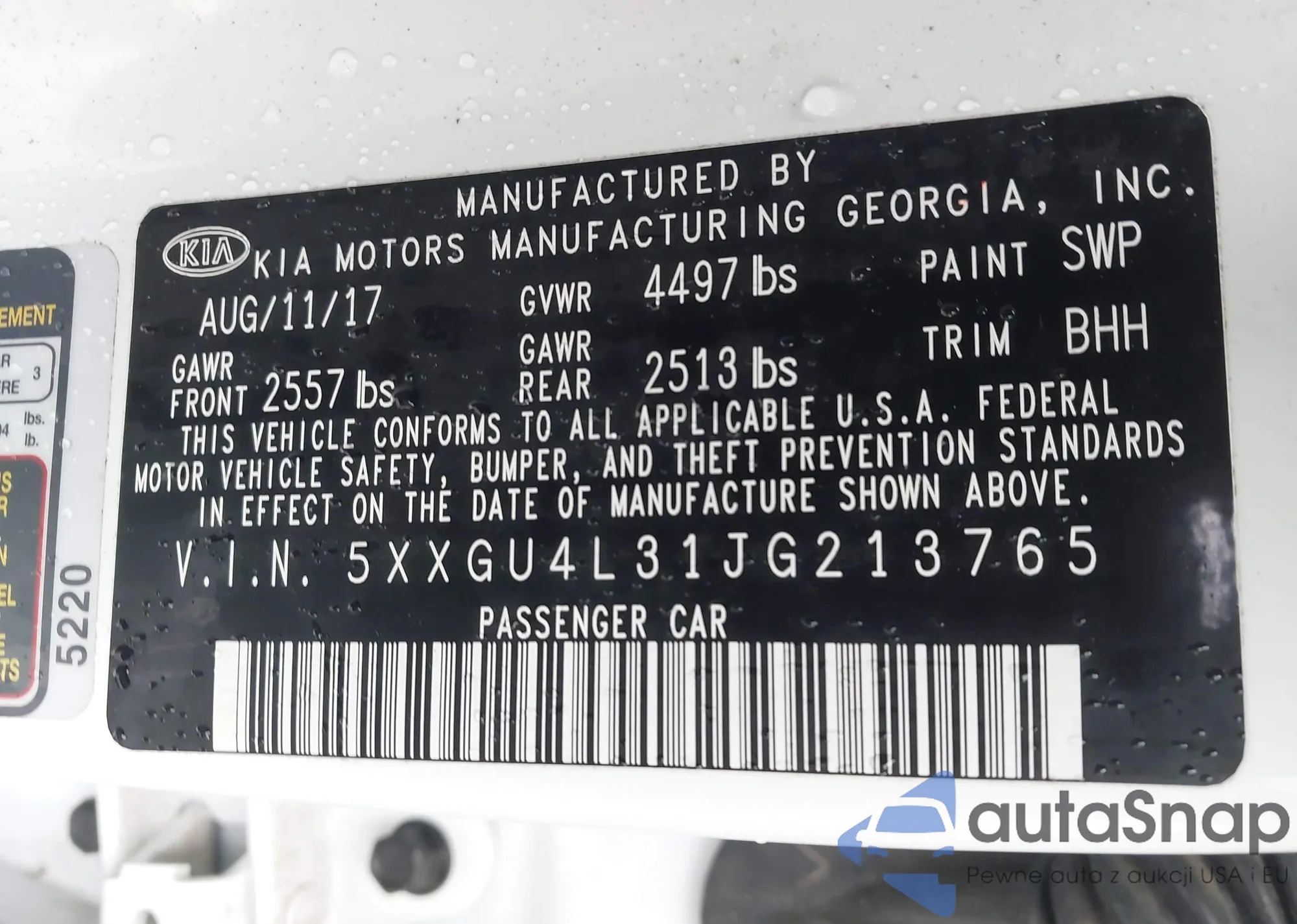 • VIN 5XXGU4L31JG213765