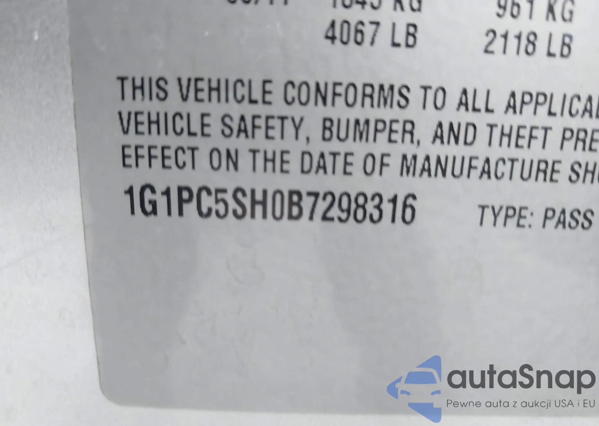 LOT: 43866205 VIN: 1G1PC5SH0B7298316