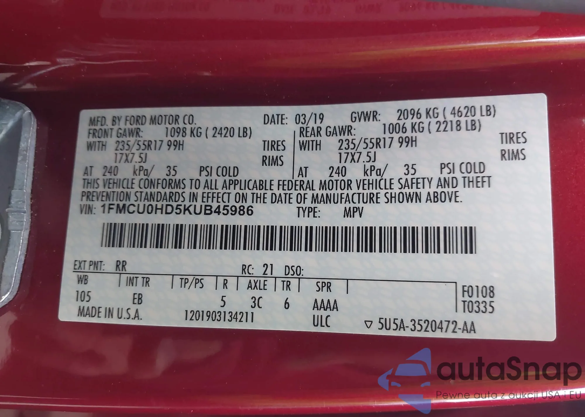 • VIN 1FMCU0HD5KUB45986
