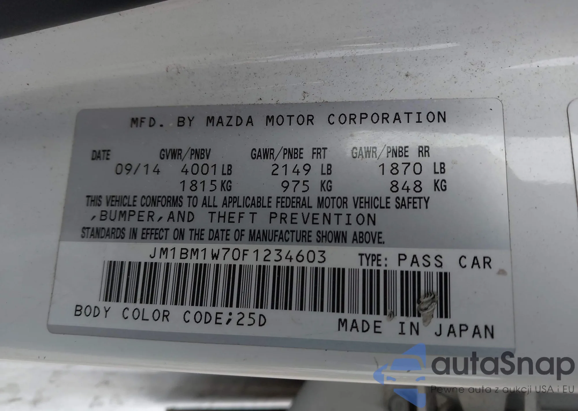 LOT: 43978494 VIN: JM1BM1W70F1234603