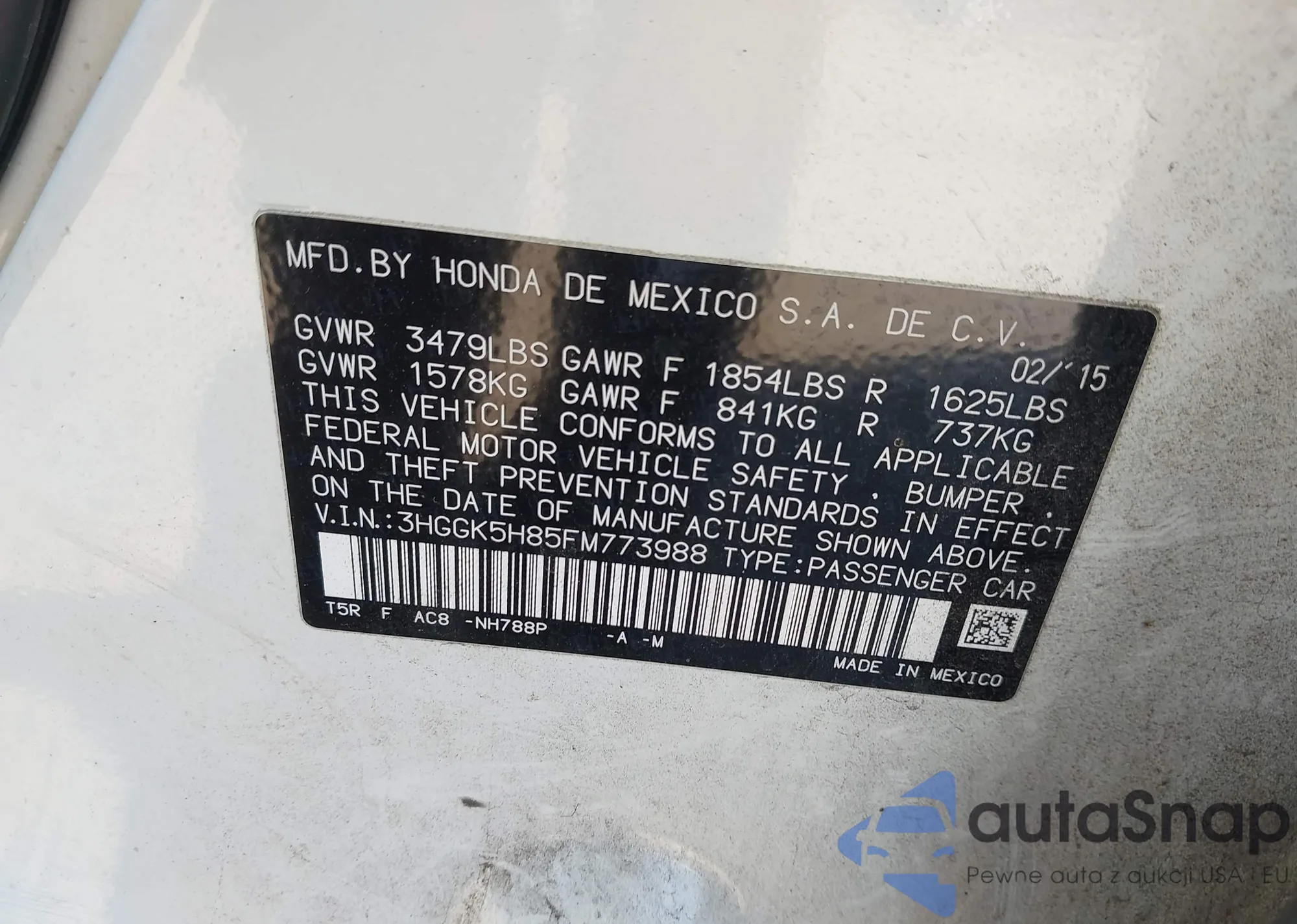 LOT: 43873092 VIN: 3HGGK5H85FM773988