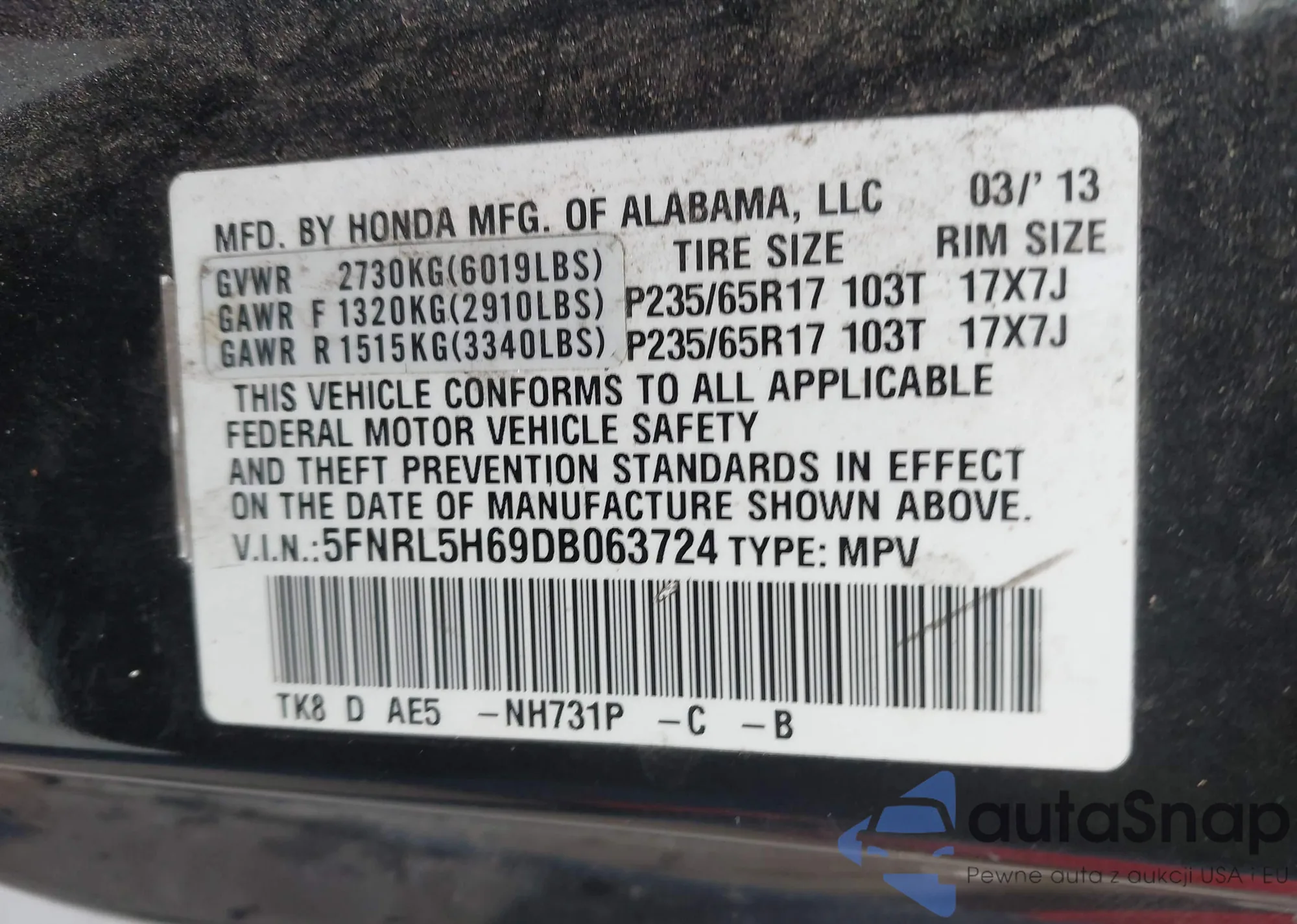 • VIN 5FNRL5H69DB063724